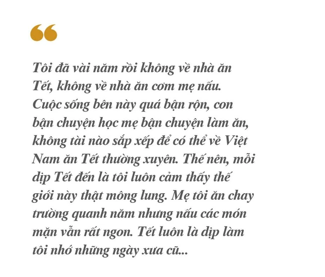 Ừ, có khác gì ở Việt Nam đâu, có chuyện gì là về nhà mẹ. Mẹ nấu món gì cũng thấy ngon. Ăn cho đã rồi còn gói mang về nhà mình. Mẹ con có giận nhau kiểu gì mà biết mẹ nấu món ngon cũng ráng mò về ăn. Và lễ Tết là dịp chính thức công khai về ăn chực mà không bị mẹ càm ràm, không bị “mang tiếng”, chỉ thấy đủ đầy ấm áp trong mọi nghĩa.