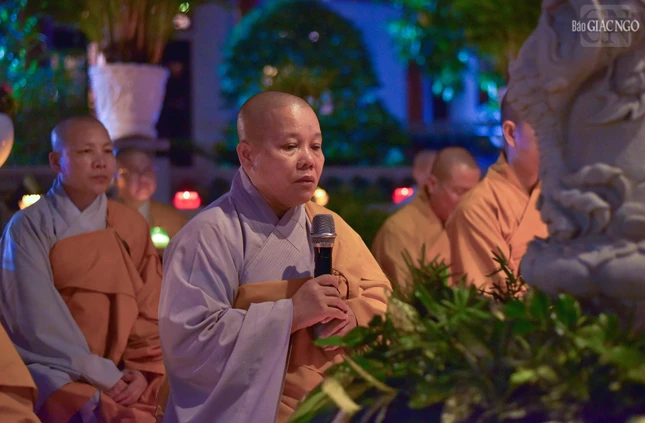 Trước bảo tháp Pháp Lạc trong khuôn viên thiền viện Vạn Hạnh, Thượng tọa Thích Tâm Minh, giáo thọ sư tại Học viện Phật giáo VN tại TP.HCM, Trưởng pháp tử của cố Trưởng lão Hòa thượng Thích Minh Châu, trụ trì thiền viện Vạn Hạnh, tán than Ban Tổ chức đêm hoa đăng tưởng niệm cố Trưởng lão Hòa thượng Viện trưởng sáng lập - tượng đài lớn của sự nghiệp chấn hưng và phát triển Phật giáo Việt Nam của thế kỷ XX cùng các vị giáo thọ sư đã mất - những người đã đóng góp cho việc giáo dục Tăng tài, tạo nguồn nhân lực lớn cho Giáo hội; quý ân nhân luôn sát cánh, hộ trì cho Tăng Ni sinh; chư vị huynh đệ đồng môn đã viện tịch.