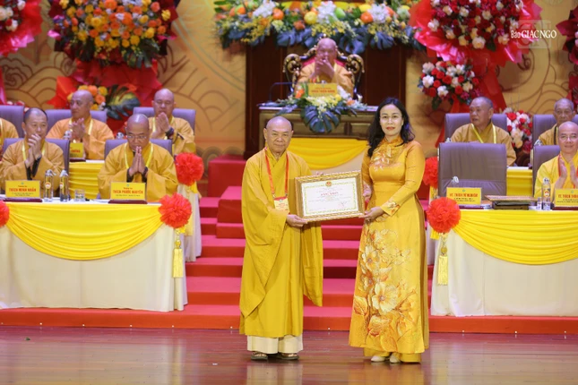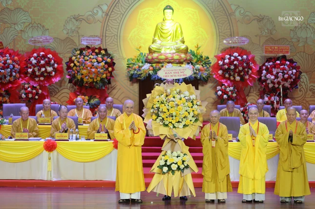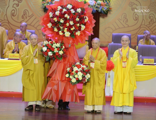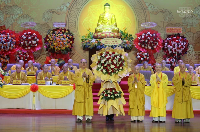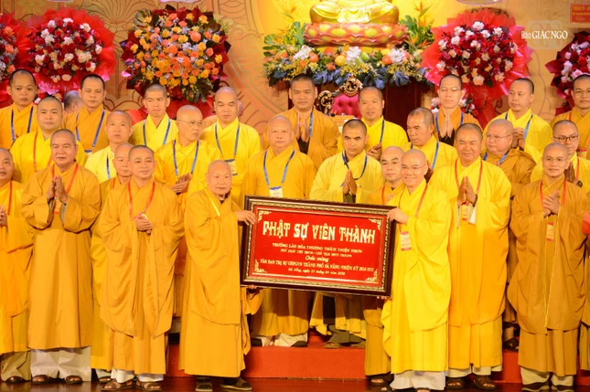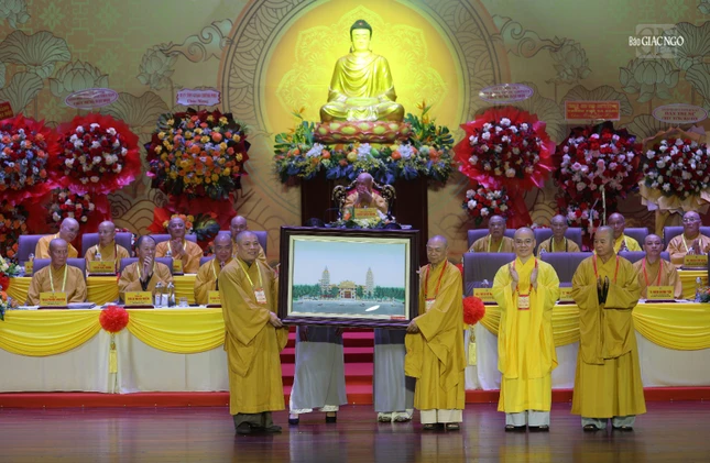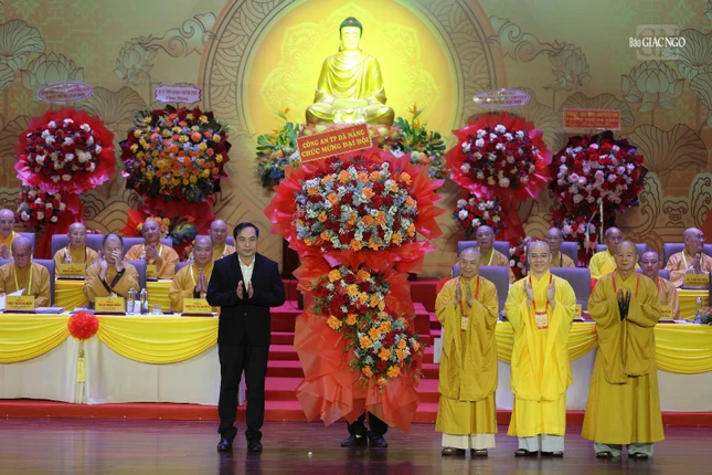 Thay mặt Trung ương GHPGVN, Trưởng lão Hòa thượng Thích Thiện Nhơn tặng khánh vàng và hoa chúc mừng tân Ban Trị sự Phật giáo TP.Đà Nẵng nhiệm kỳ 2026-2031.