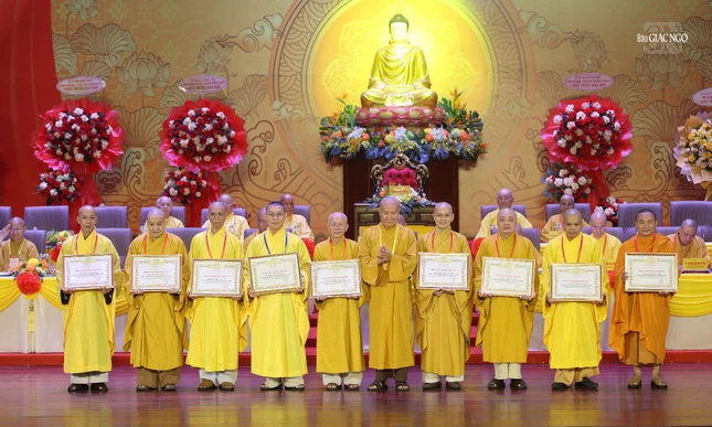 Dịp này, Thượng tọa Thích Minh Nhẫn, Ủy viên Thư ký Hội đồng Trị sự, Phó Chánh Văn phòng II T.Ư công bố quyết định tặng Bằng tuyên dương công đức của Trung ương Giáo hội đến tập thể các ban chuyên ngành và 33 cá nhân Ban Trị sự thành phố có nhiều đóng góp trong công tác Phật sự nhiệm kỳ 2022-2027.