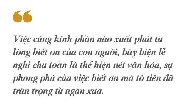 Đồng thời, việc cúng kính phần nào xuất phát từ lòng biết ơn của con người, bày biện lễ nghi chu toàn là thể hiện nét văn hóa, sự phong phú của việc biết ơn mà tổ tiên đã trân trọng từ ngàn xưa.