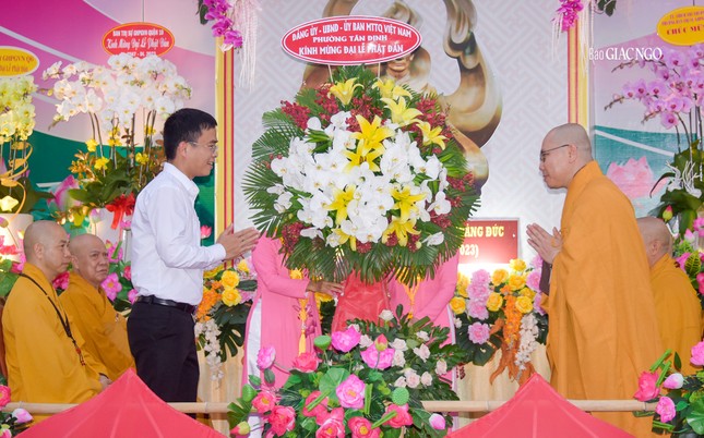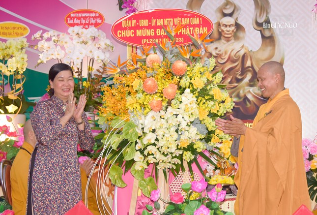 Để chào mừng Đại lễ Phật đản Phật lịch 2567 của Phật giáo Q.1, bà Mai Thị Hồng Hoa, Phó Chủ tịch UBND Q.1 phát biểu chúc sức khỏe đến chư Tăng Ni, tín đồ Phật giáo trên địa bàn. Bà cũng ghi nhận, đánh giá cao những thành quả mà Phật giáo Q.1 đã đạt được trong công tác an sinh xã hội thời gian qua và bày tỏ hy vọng Ban Trị sự GHPGVN quận tiếp tục hướng dẫn tín đồ chung sức cùng chính quyền xây dựng quận nhà phát triển hơn.