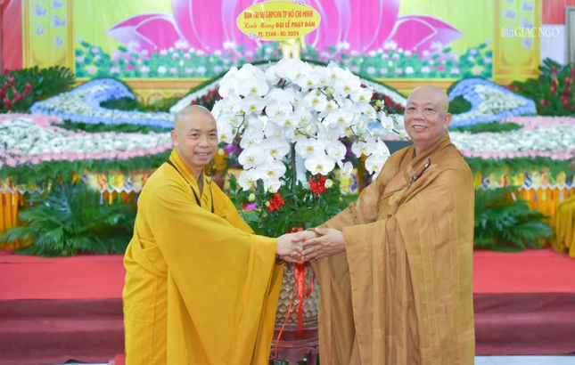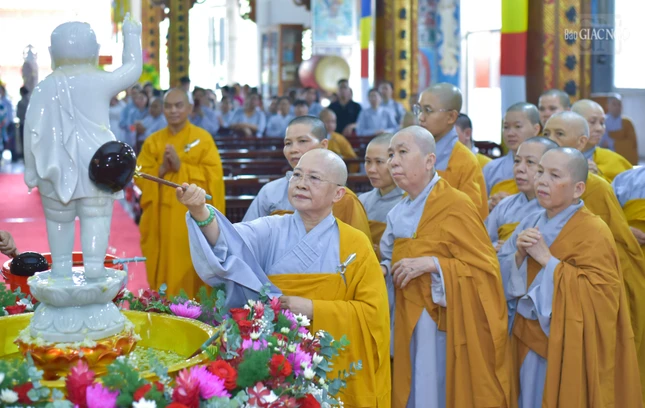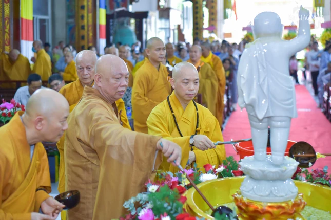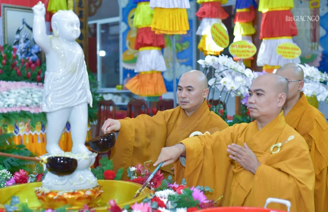 Sau đó, chư tôn giáo phẩm đã thành kính dâng hương, đồng tụng sám Khánh đản, thực hiện nghi thức Tắm Phật truyền thống nhằm thể hiện lòng tôn kính dâng lên cúng dường Đức Thế Tôn nhân Khánh đản của Ngài.