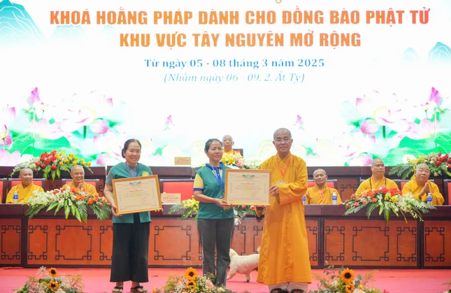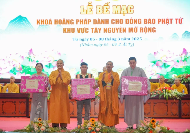 Tại buổi lễ bế mạc, chư tôn đức đã trao những phần quà khích lệ đến đại diện các Phật tử các tỉnh thành, trao Bằng tuyên dương công đức cho các tỉnh thành có thành tích xuất sắc trong khóa tu lần này; các Tiểu ban ngoại hộ và trao giấy chứng nhận cho các Phật tử đại diện cho 14 tỉnh thành tham dự khóa Hoằng pháp năm 2025.