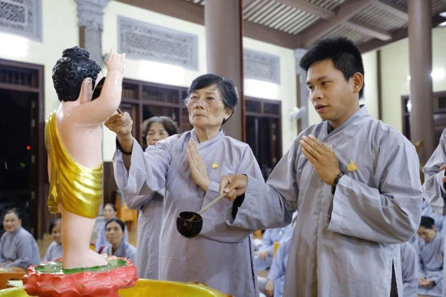 Tại chánh điện chư tôn đức và đại chúng đã trang nghiêm cử hành nghi thức niêm hương bạch Phật, trì tụng thời sám Khánh đản. Thượng tọa trụ trì và chư Tăng đã thực hiện nghi thức Tắm Phật kính mừng ngày Đản sanh của Đức Bổn Sư Thích Ca Mâu Ni. Các Phật tử tham dự khóa lễ đã được hướng dẫn tuần tự thực hiện nghi thức Tắm Phật với tấm lòng thành kính dâng lên ngày Đản sanh của Đức Từ Phụ.