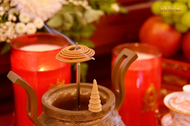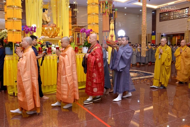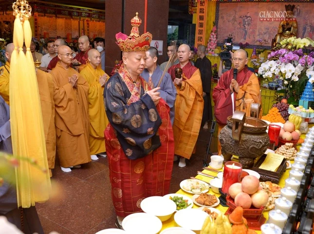 GNO - Chiều 20-8 (23-7-Nhâm Dần), ngày thứ ba của Đại lễ tưởng niệm, kỳ siêu đồng bào tử vong, cán bộ, chiến sĩ hy sinh trong đại dịch Covid-19, Hòa thượng Thích Lệ Trang, Trưởng ban Trị sự GHPGVN TP.HCM làm gia trì sư chẩn tế âm linh cô hồn theo nghi thức Đại khoa Du-già