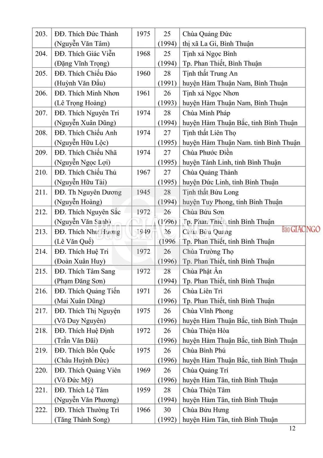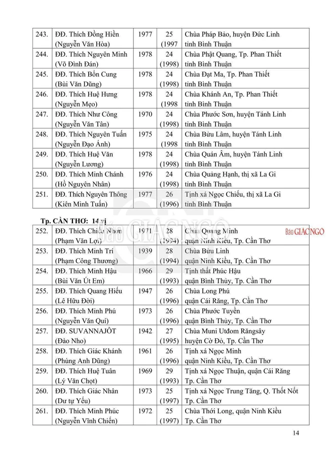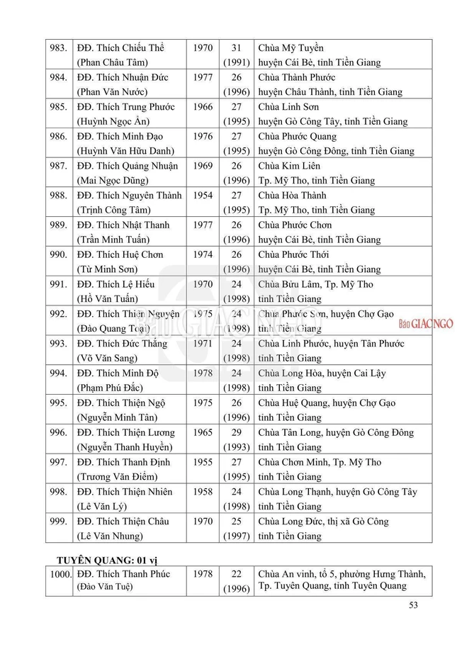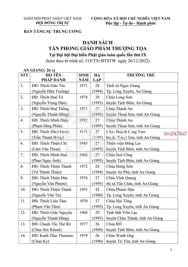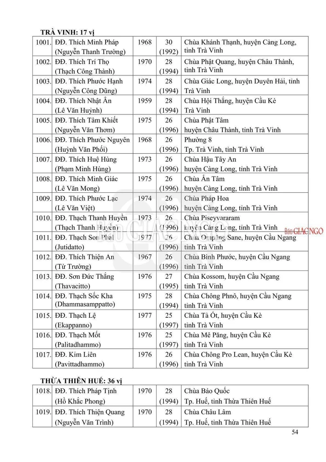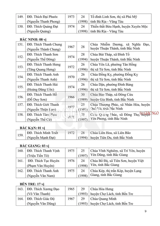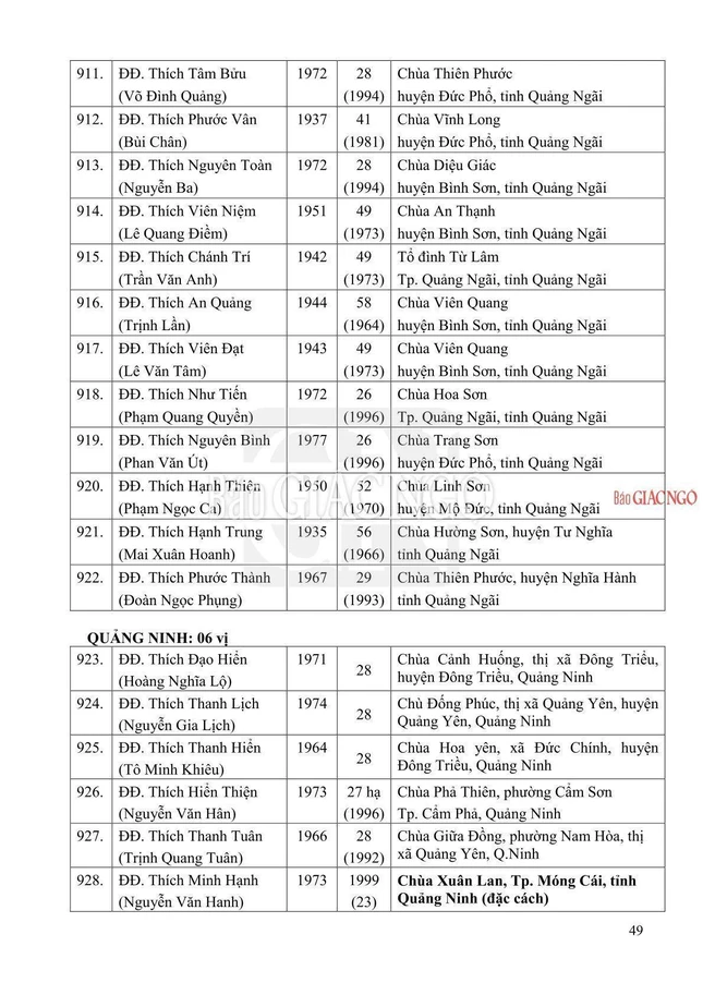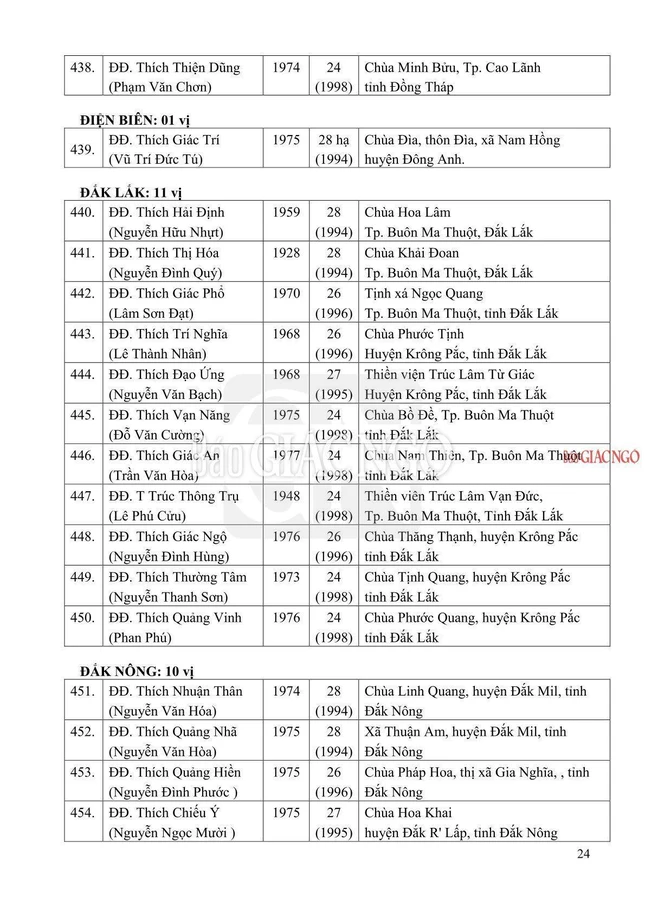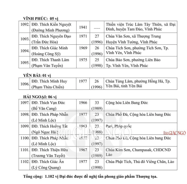 Danh sách 1.102 vị được tấn phong Thượng tọa tại Đại hội IX GHPGVN