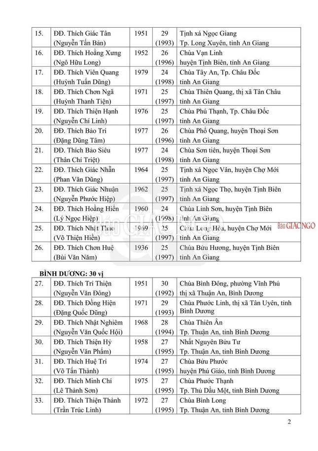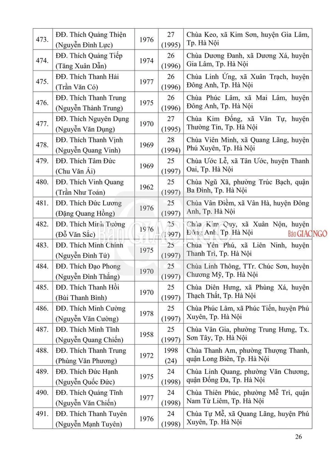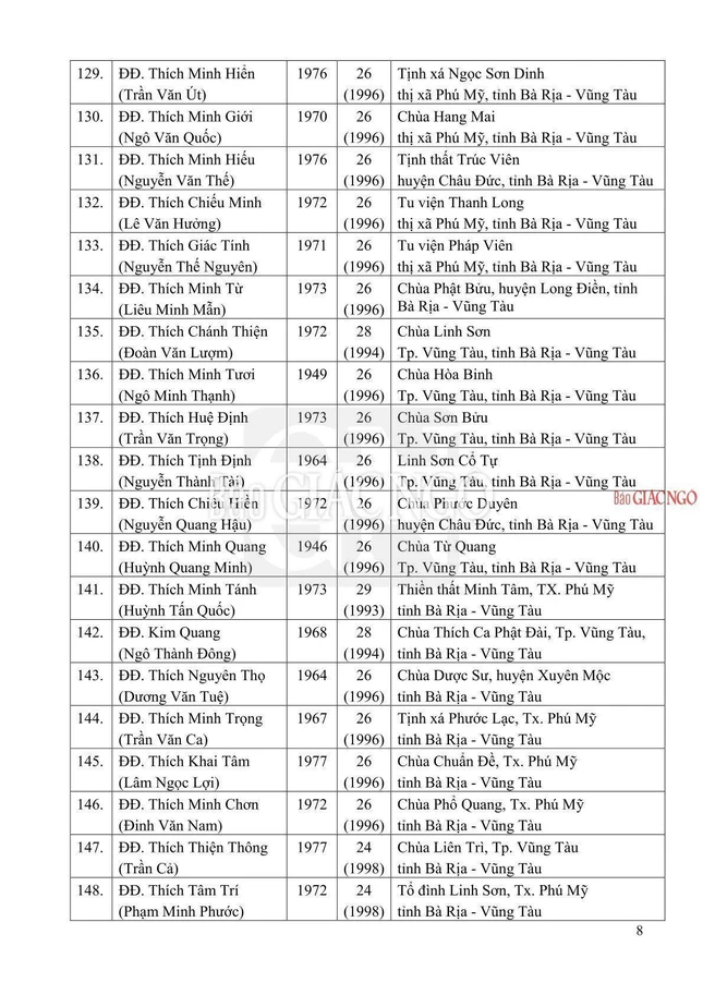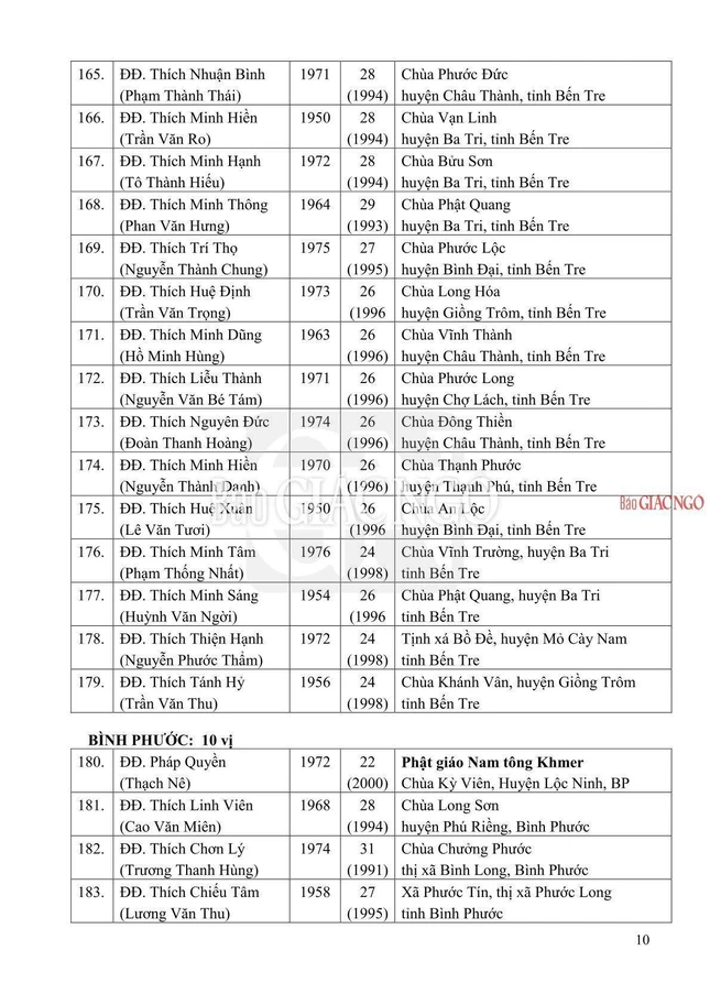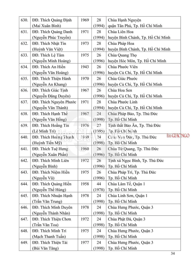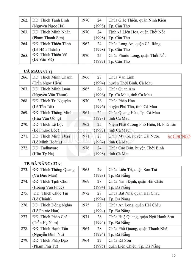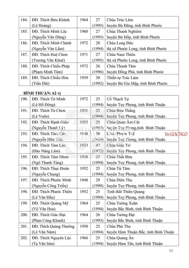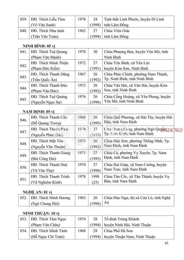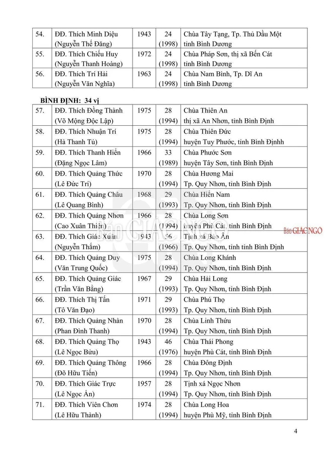 Danh sách 1.102 vị được tấn phong Thượng tọa tại Đại hội IX GHPGVN