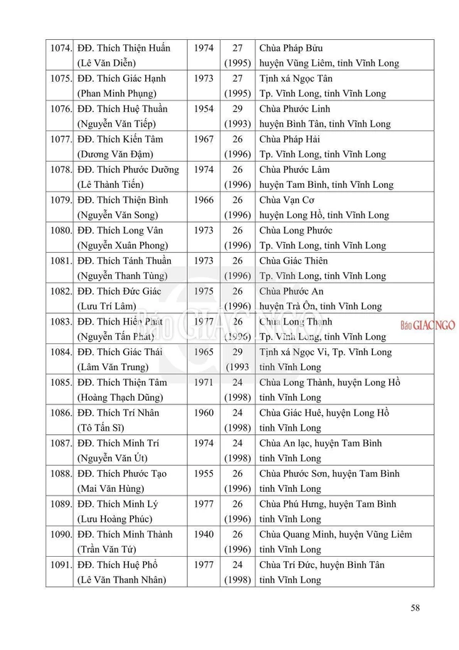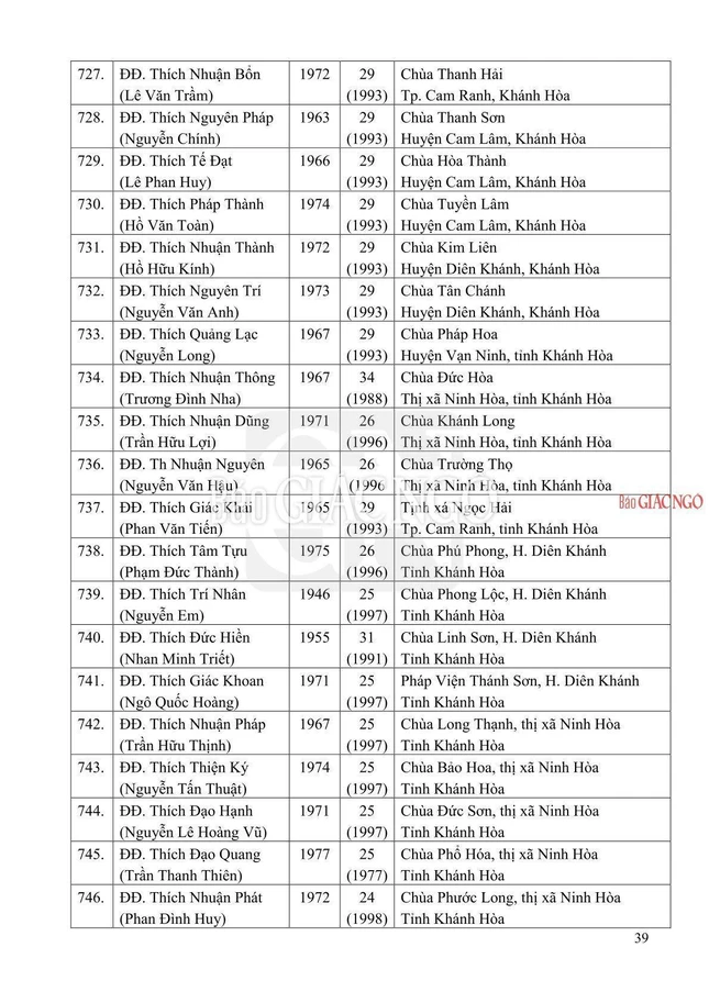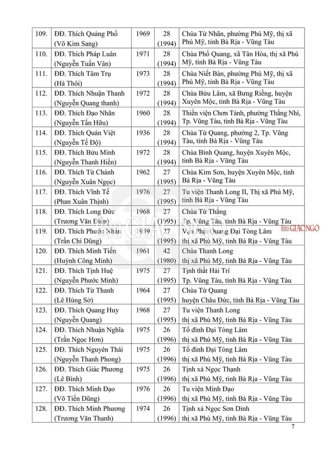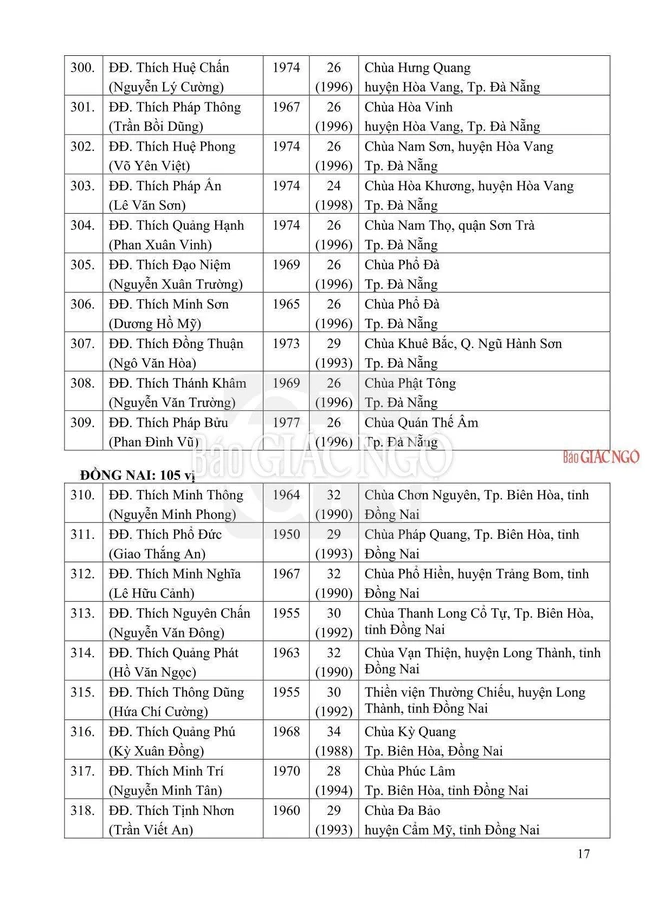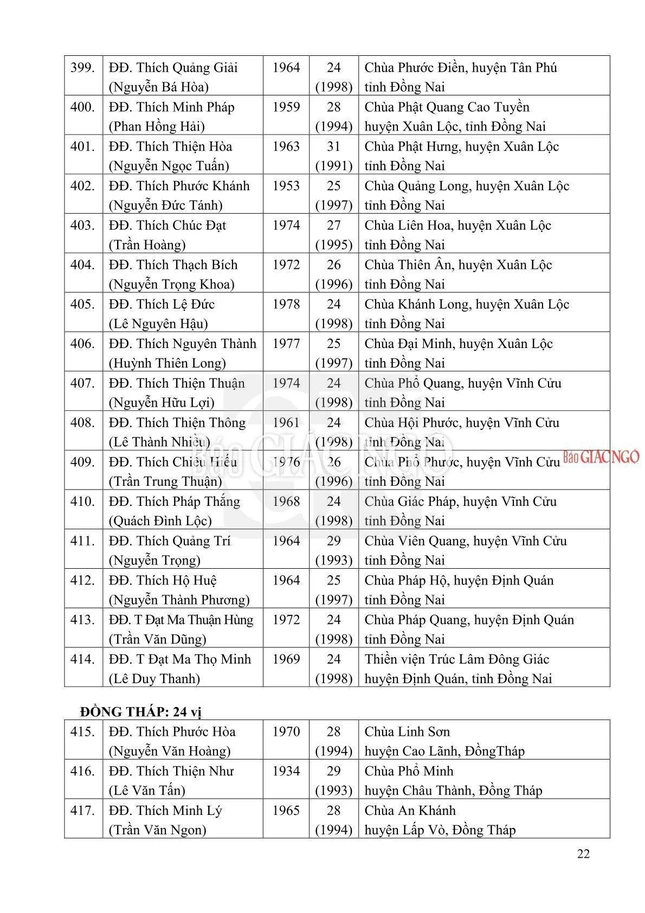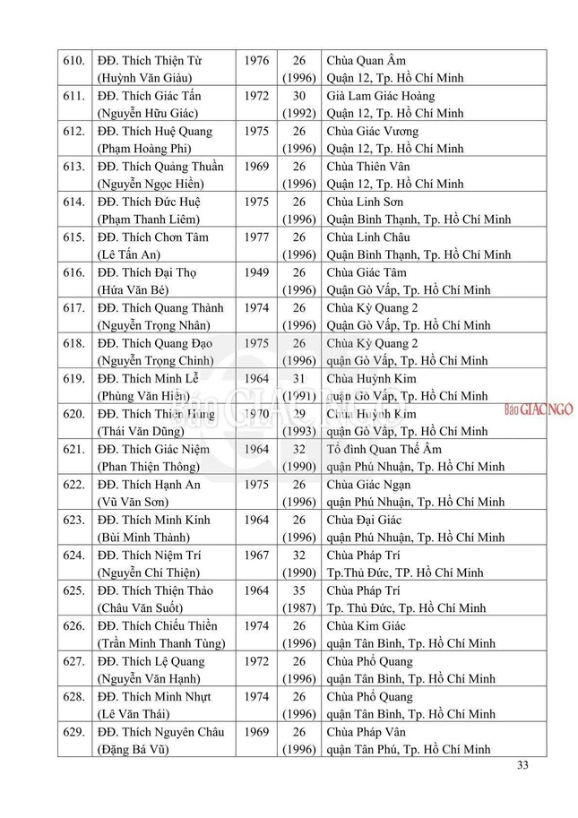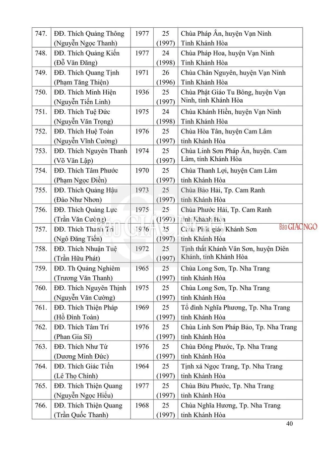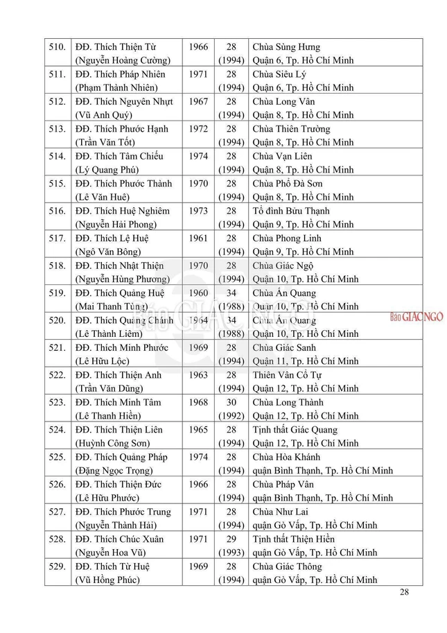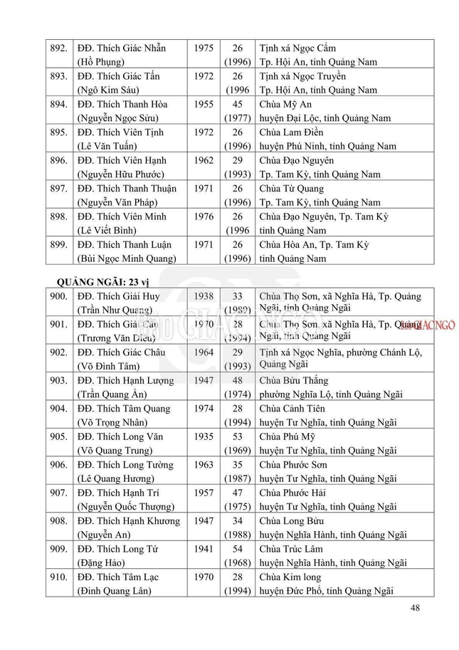 Danh sách 1.102 vị được tấn phong Thượng tọa tại Đại hội IX GHPGVN