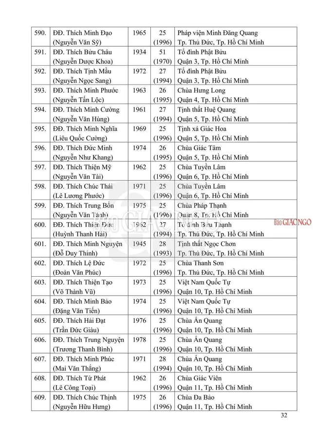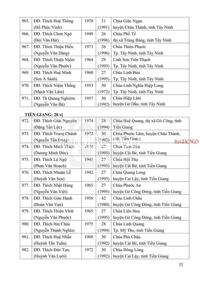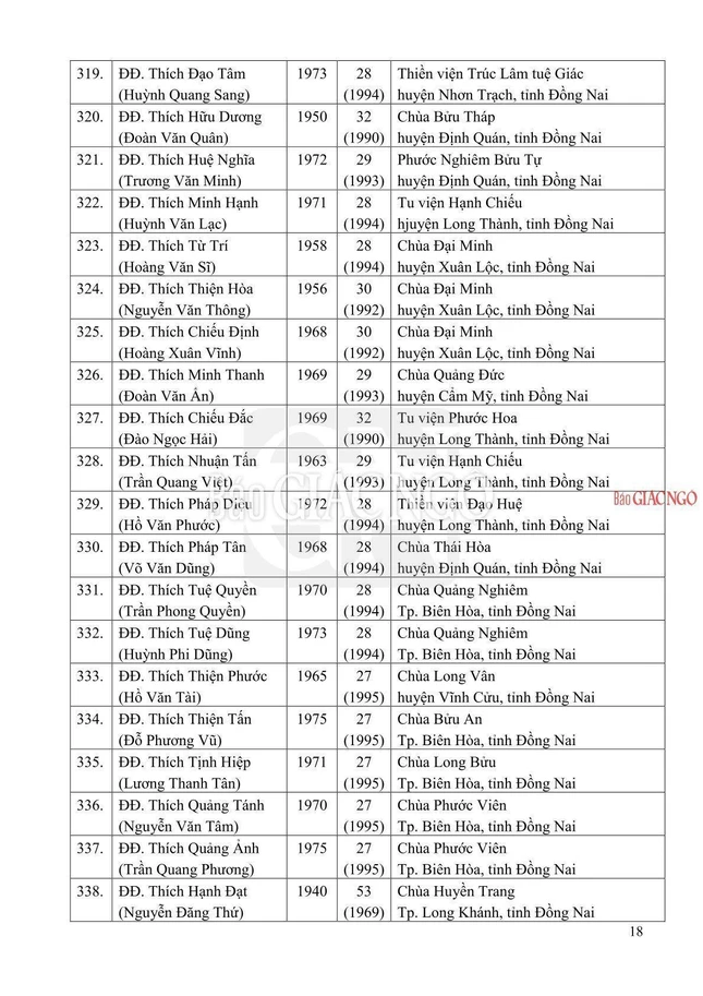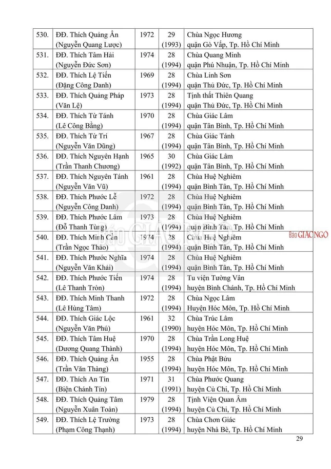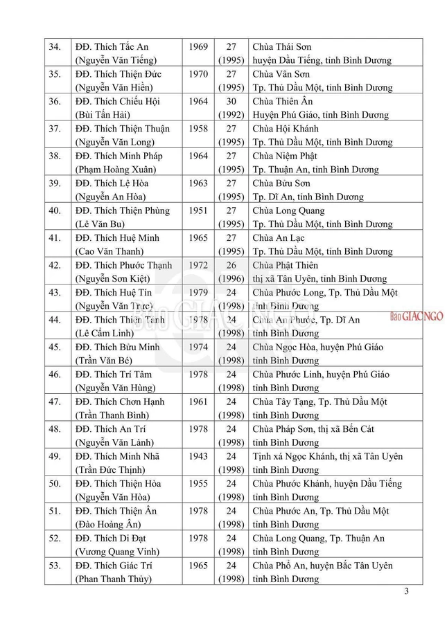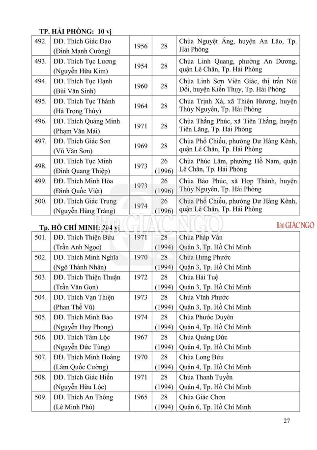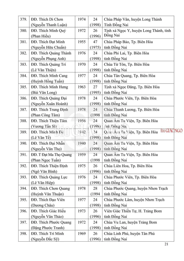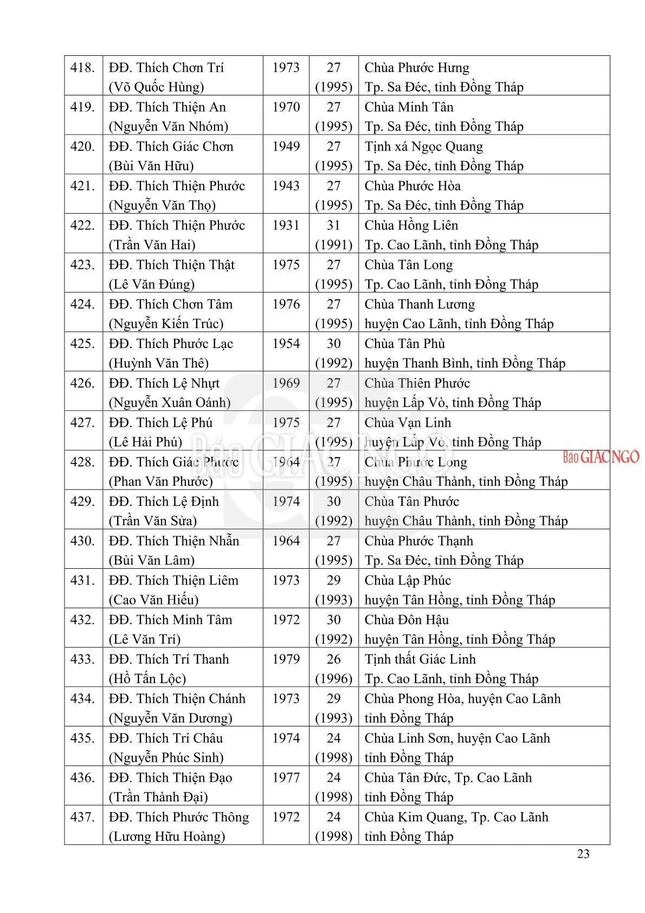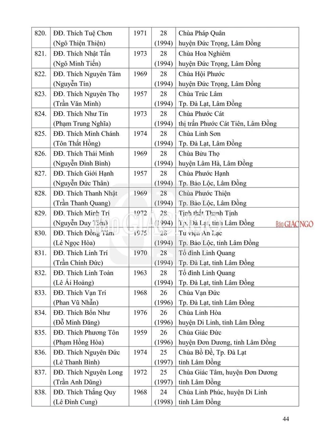 Danh sách 1.102 vị được tấn phong Thượng tọa tại Đại hội IX GHPGVN