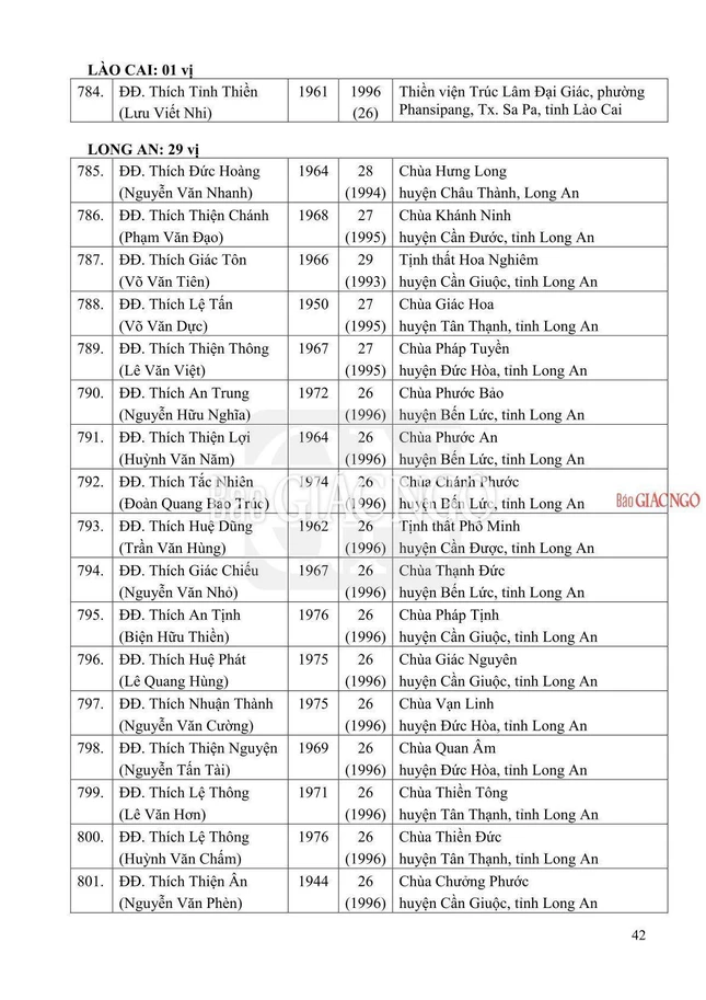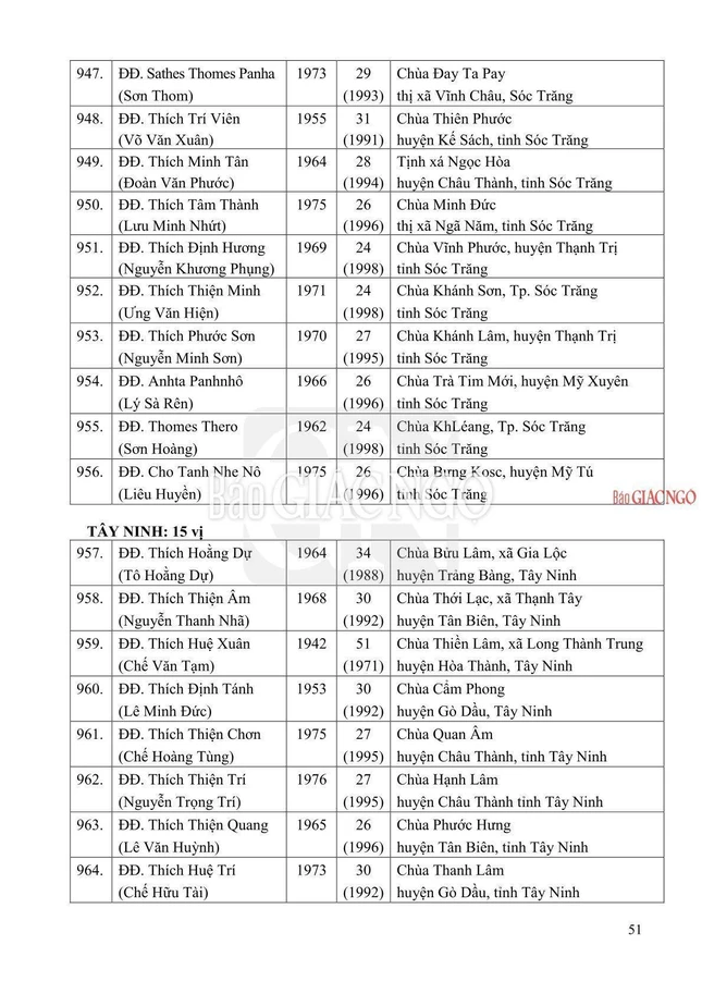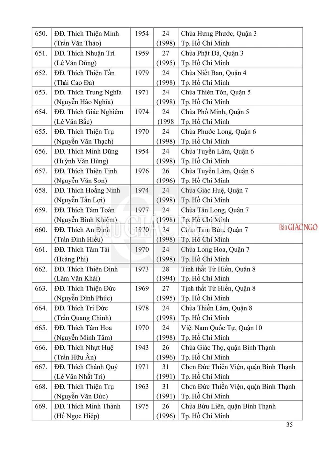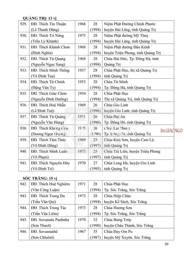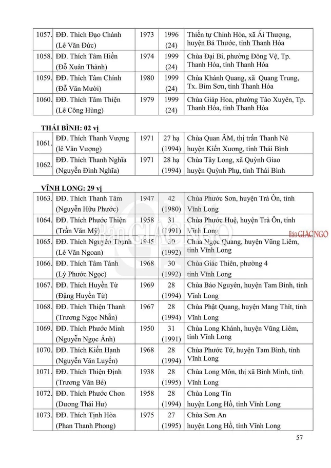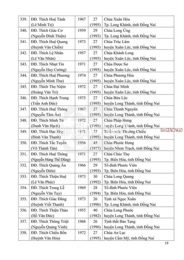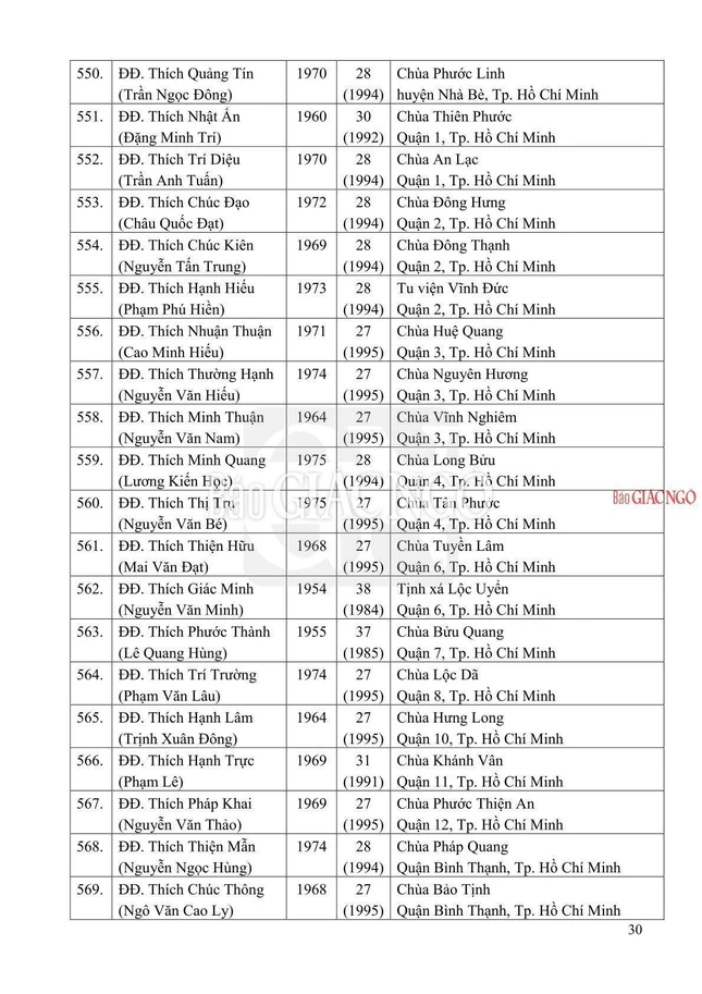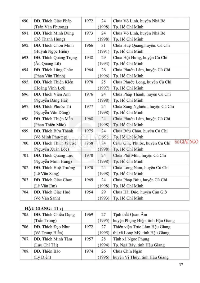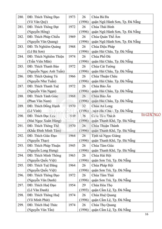 Danh sách 1.102 vị được tấn phong Thượng tọa tại Đại hội IX GHPGVN