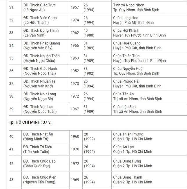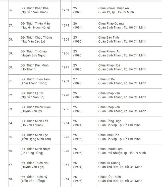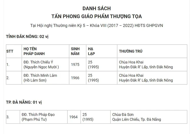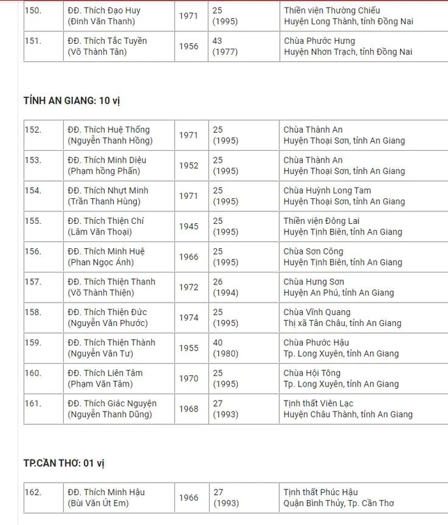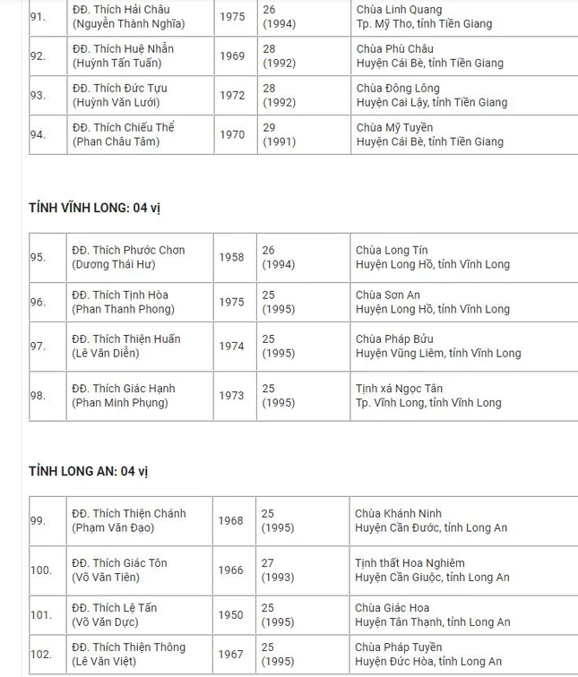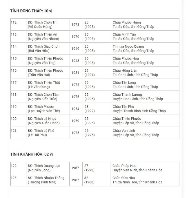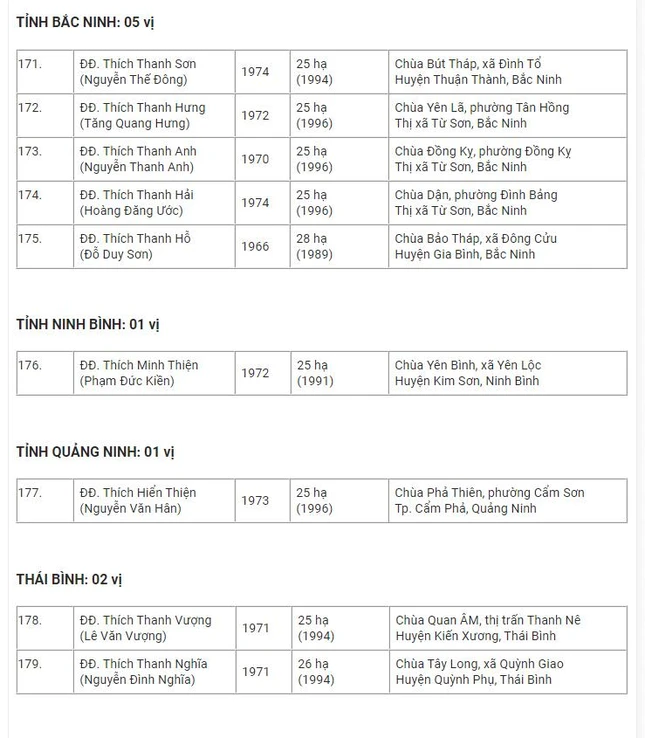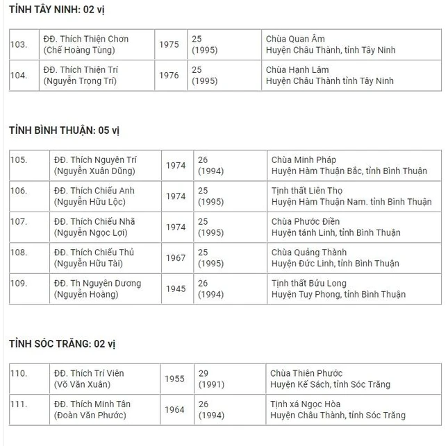 Danh sách 182 vị được tấn phong Thượng tọa tại Hội nghị kỳ 5 - khóa VIII