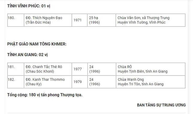 Theo đó, danh sách 182 Đại đức được tấn phong Thượng tọa: