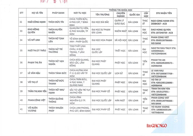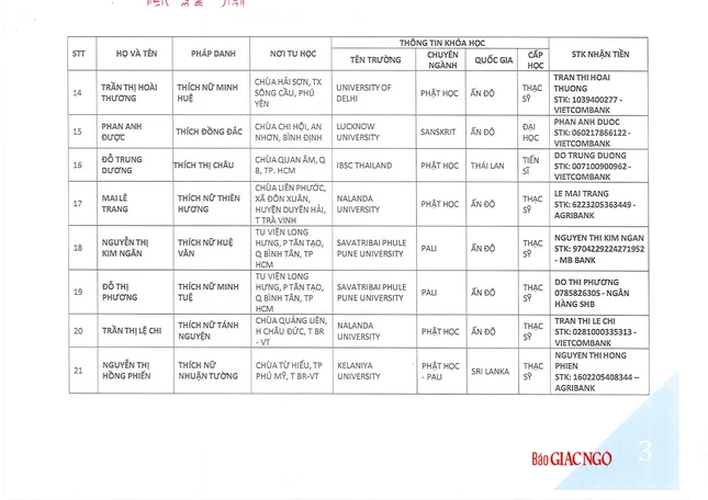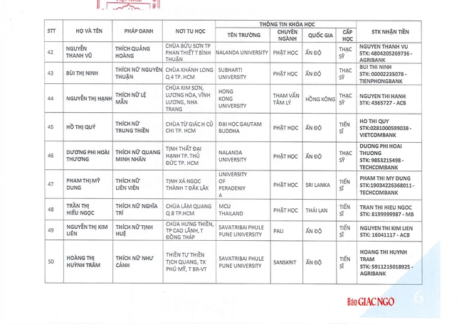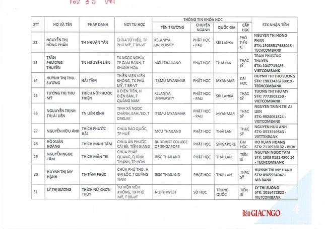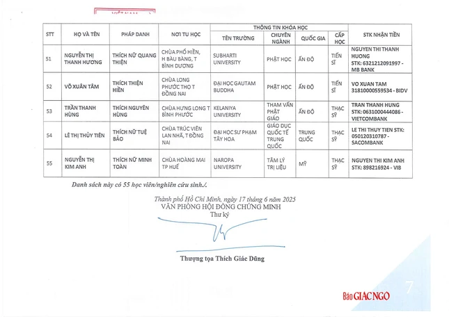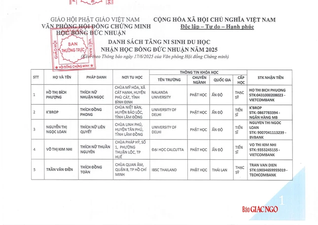 GNO - Hôm nay, 17-6, Thông tin từ Văn phòng Hội đồng Chứng minh, phụng hành huấn thị của Đức Pháp chủ và chư tôn Trưởng lão Ban Thường trực Hội đồng Chứng minh, Thượng tọa Thích Giác Dũng, Thư ký Văn phòng đã có thông báo danh sách các Tăng Ni sinh du học được nhận học bổng Đức Nhuận năm 2025.