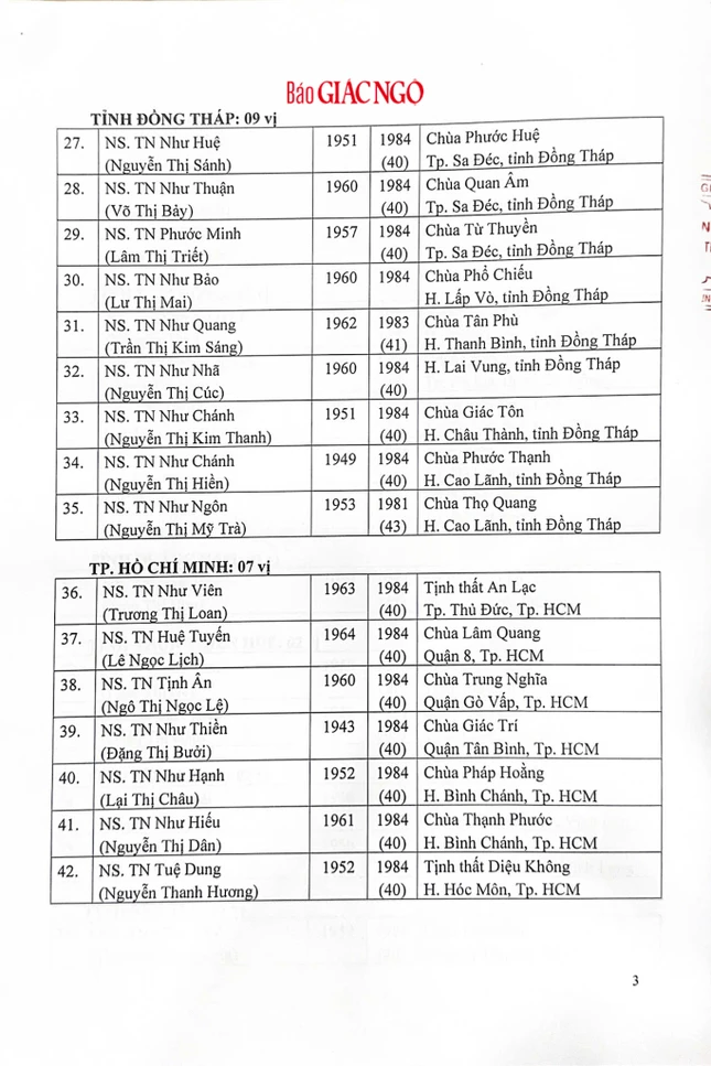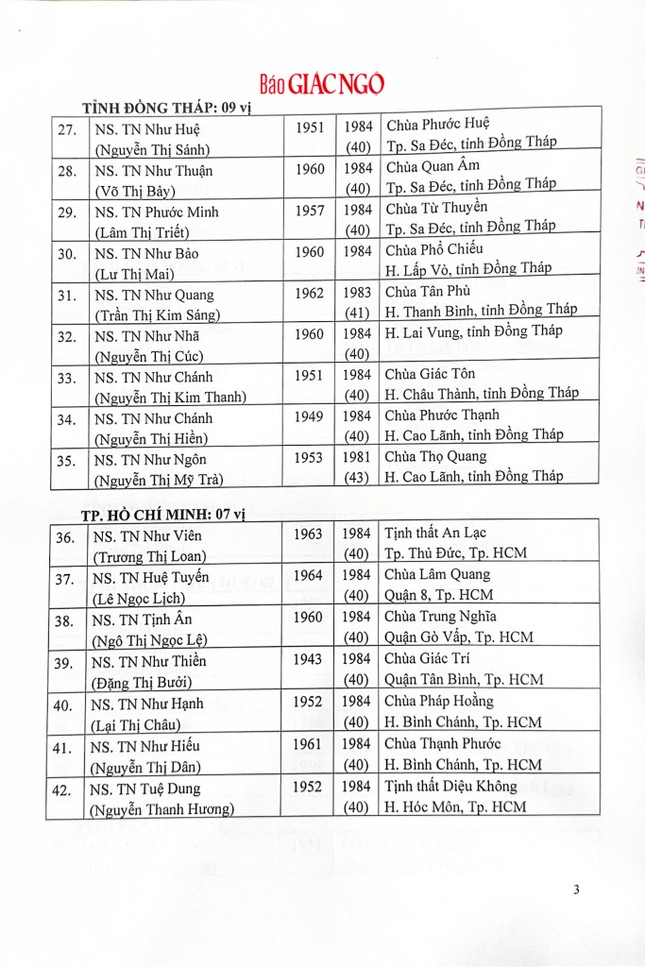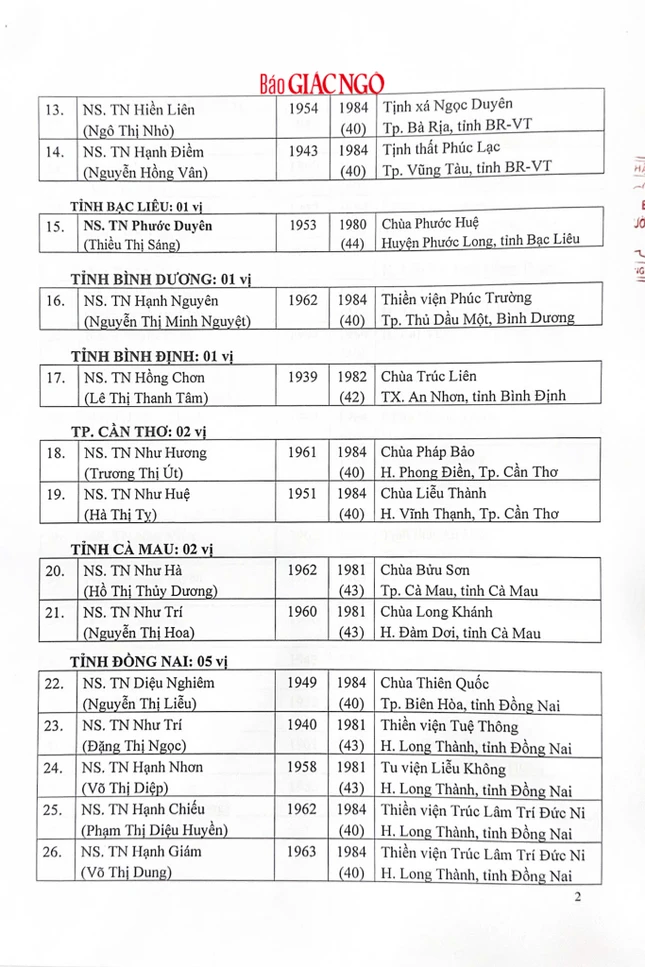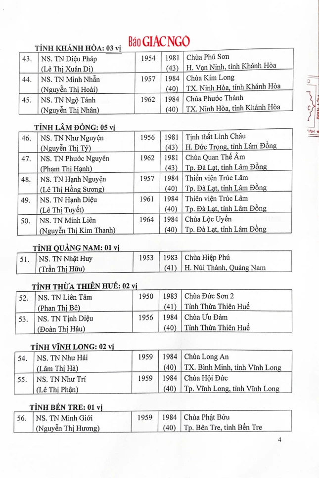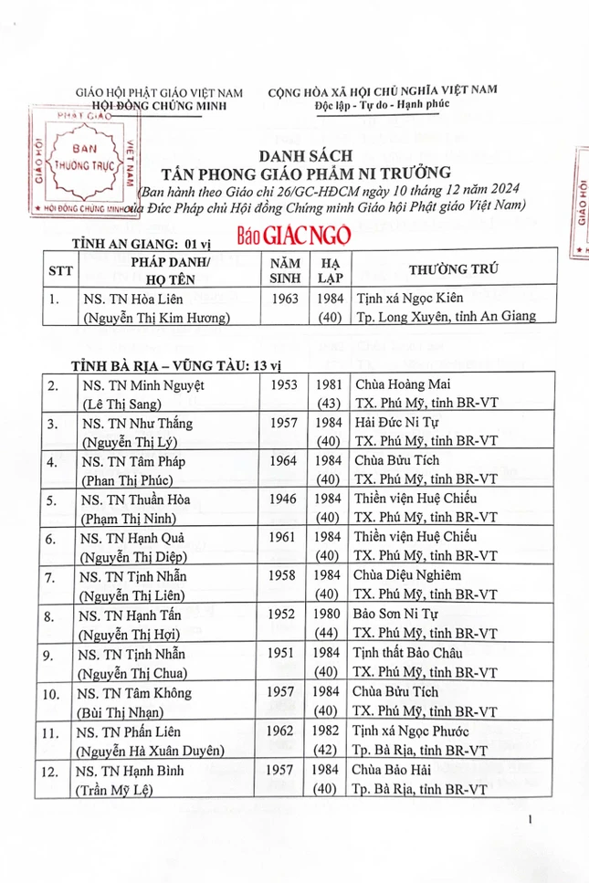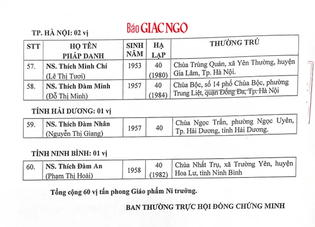 GNO - Theo đó, Đức Pháp chủ GHPGVN - Đại lão Hòa thượng Thích Trí Quảng đã ấn ký Giáo chỉ tấn phong 60 Ni sư lên hàng giáo phẩm Ni trưởng, sau khi Ban Thường trực Hội đồng Chứng minh xem xét danh sách, được Đại nghị lần thứ II Hội đồng Chứng minh thông qua.
