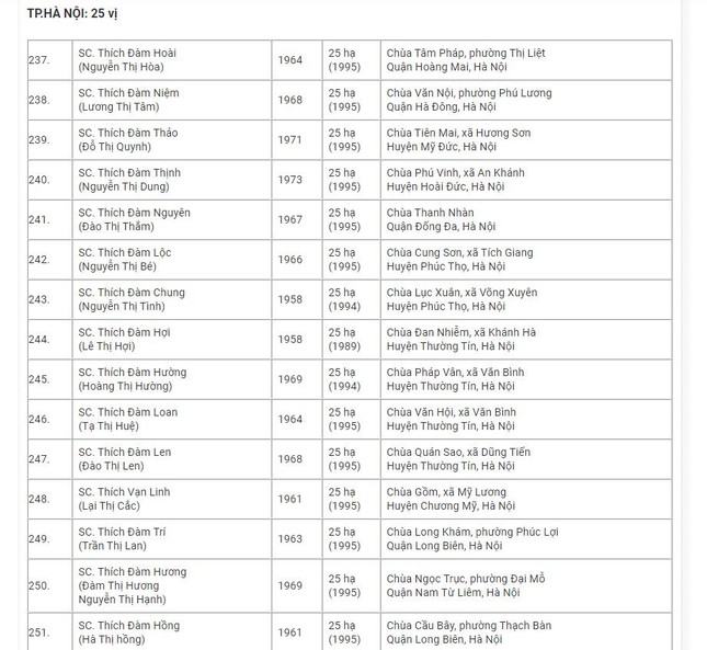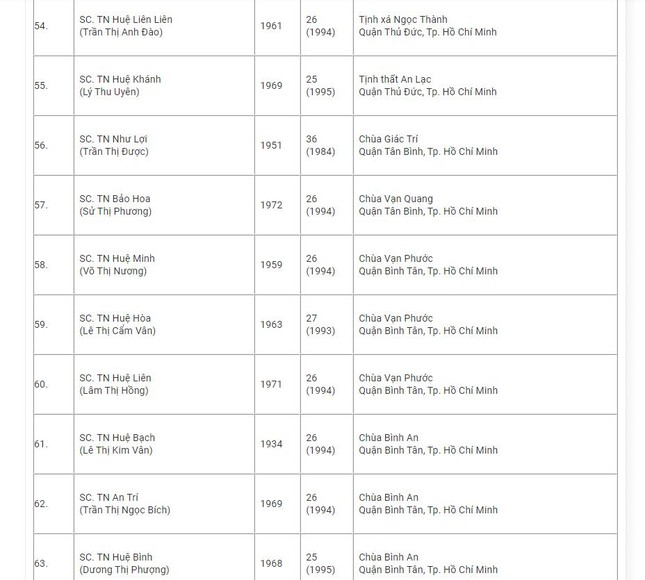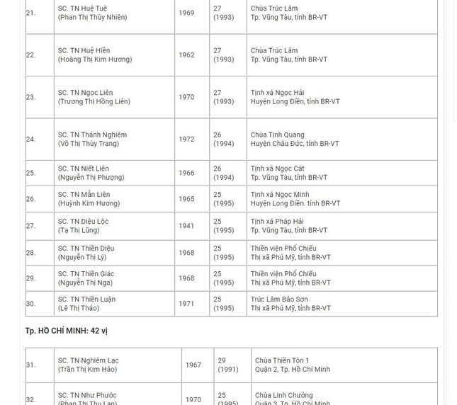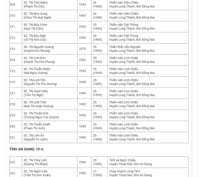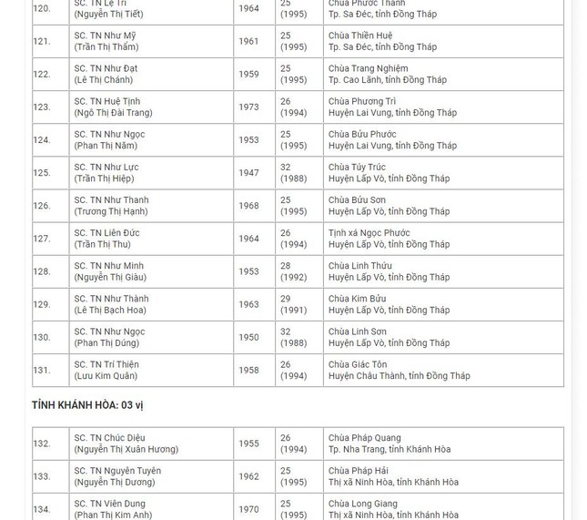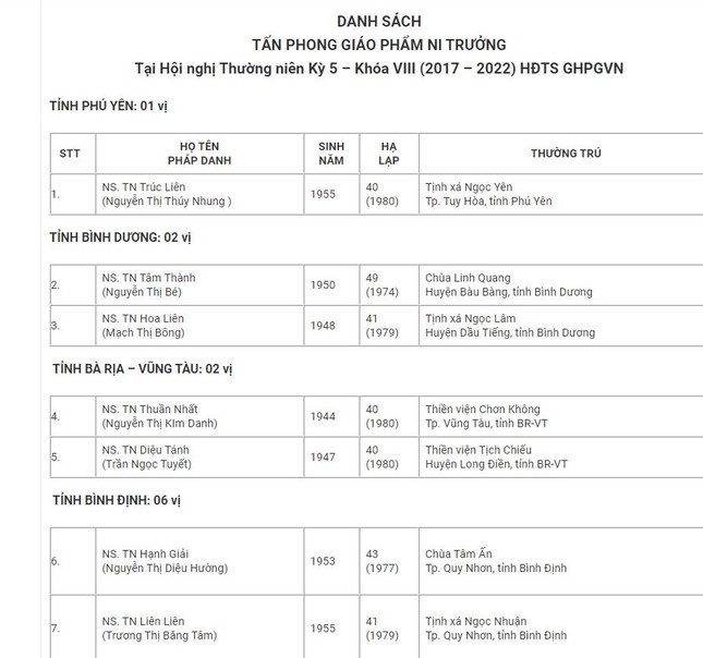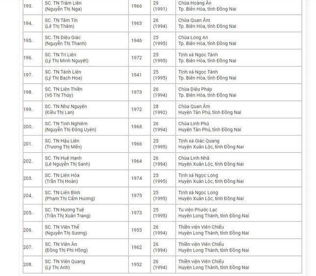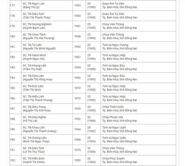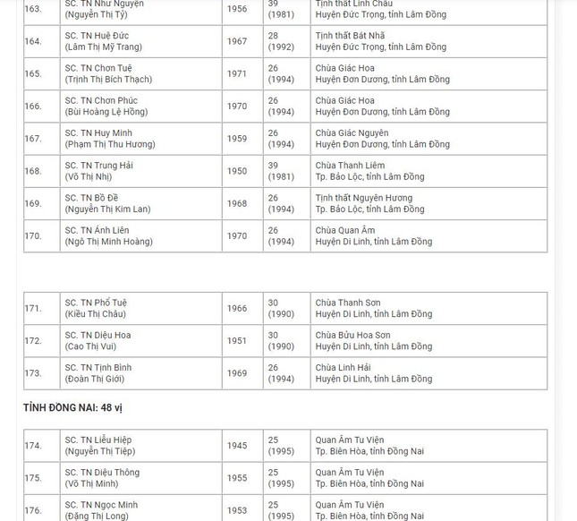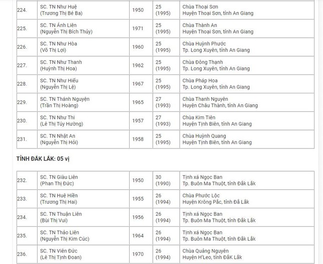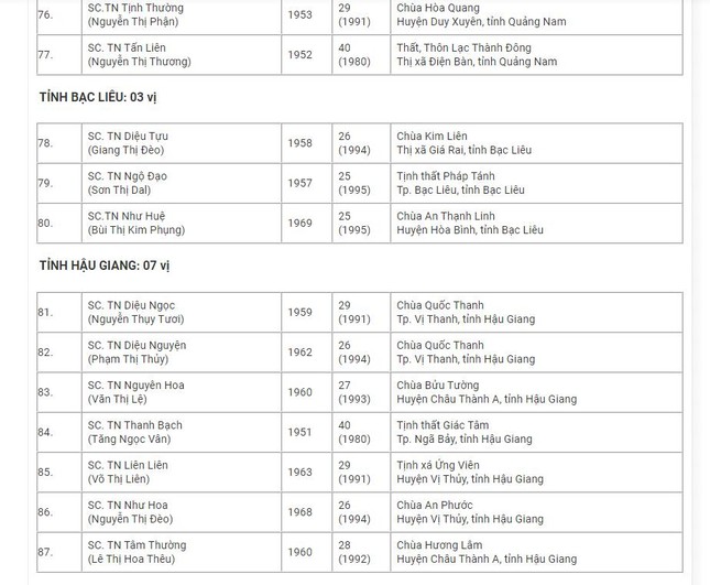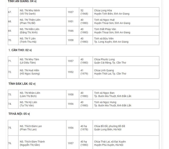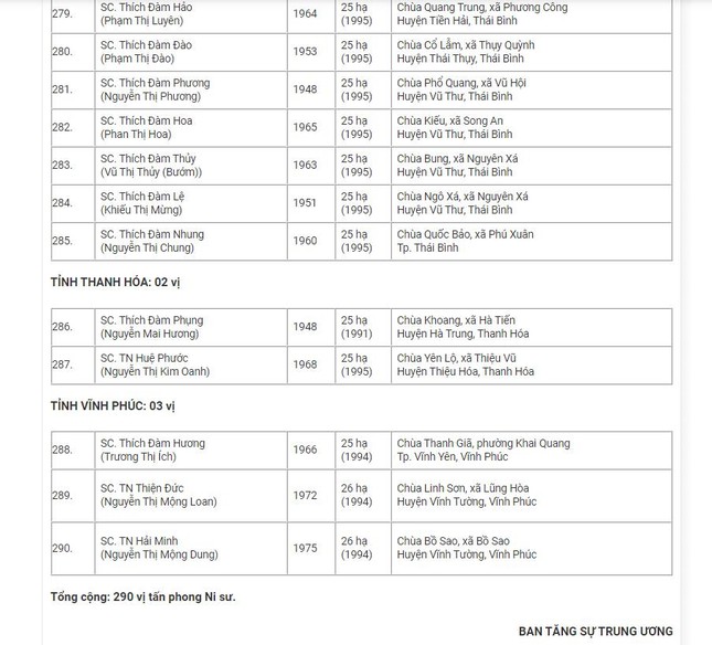 Danh sách 80 vị được tấn phong vị giáo phẩm Ni trưởng, 290 vị được tấn phong Ni sư