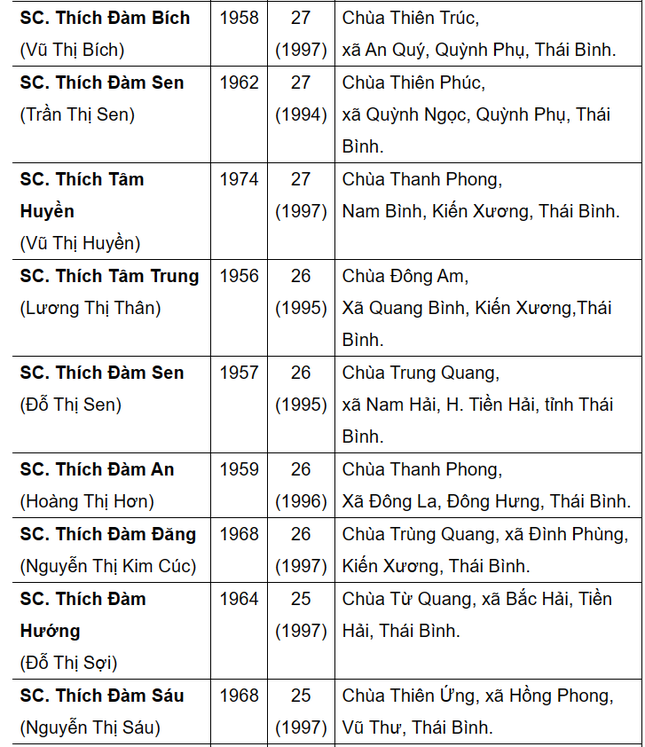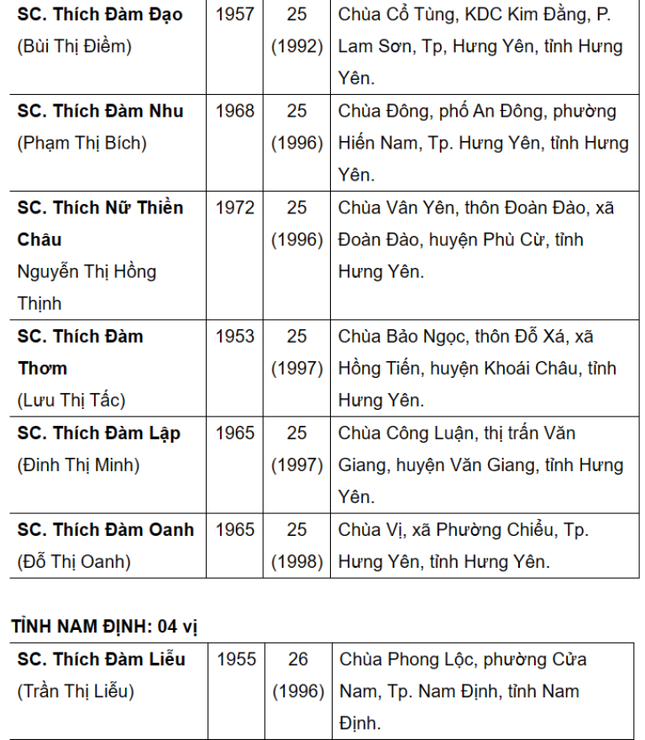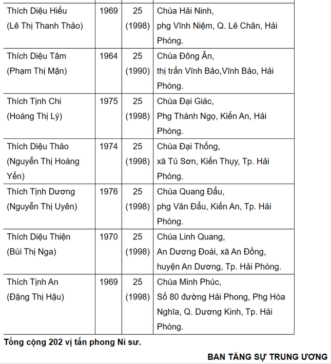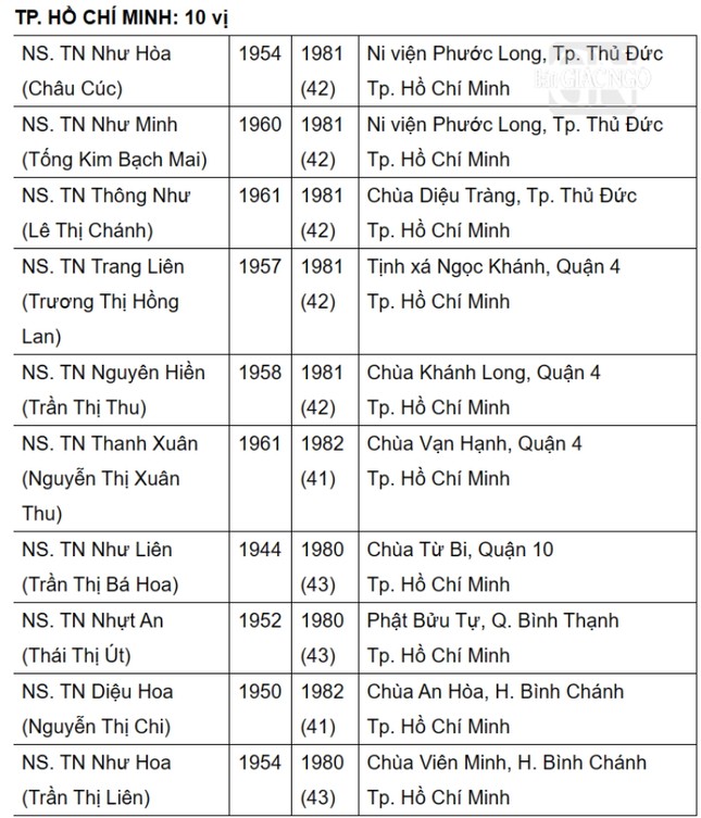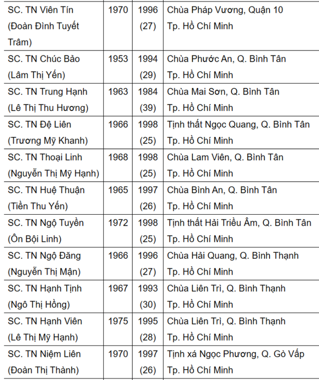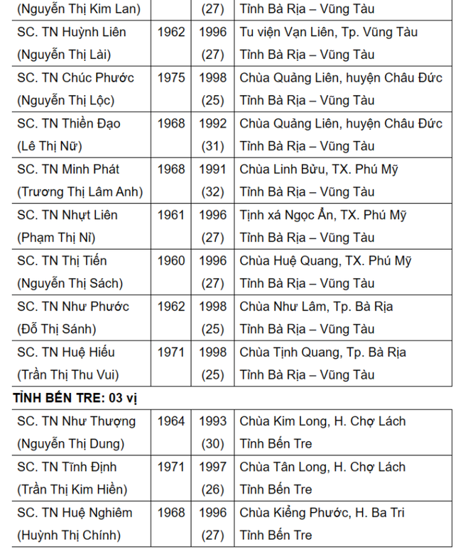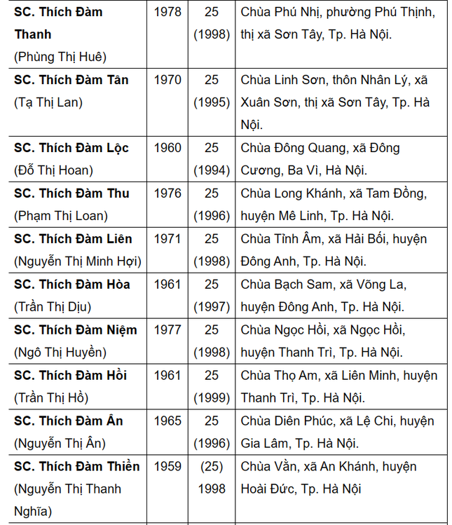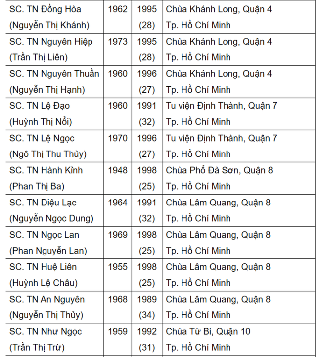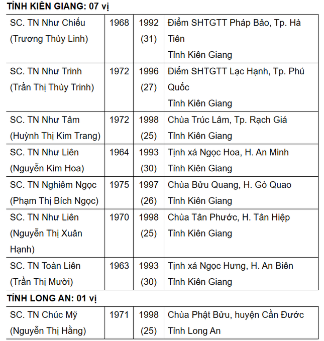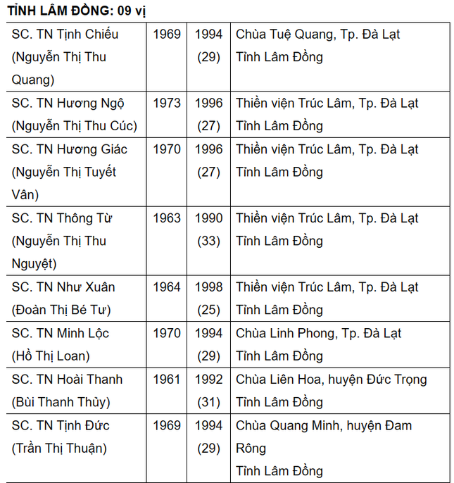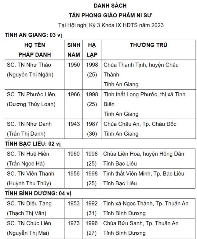 Danh sách đệ trình tấn phong giáo phẩm Ni trưởng, Ni sư tại Hội nghị Thường niên kỳ 3 - Khóa IX