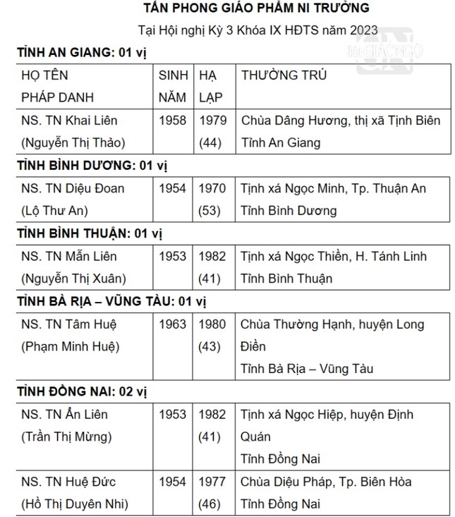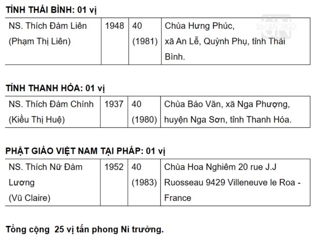 GNO -  Ngày 15-1, tại Hội nghị Thường niên kỳ 3 - Khóa IX GHPGVN thông qua danh sách tấn phong giáo phẩm gồm: 25 vị Ni sư lên giáo phẩm Ni trưởng, 202 vị Sư cô được tấn phong giáo phẩm Ni sư. Danh sách này sẽ được đệ trình Hội đồng Chứng minh xem xét và ban hành Giáo chỉ chính thức sau đó.