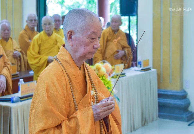Sau lời cảm tạ của Trưởng lão Hòa thượng Thích Thiện Pháp, chư tôn đức giáo phẩm Trưởng lão và hội chúng tham dự đã thành tâm đối trước tôn dung các bậc Thầy, những vị đã gắn bó và dành tâm huyết cho việc đào tạo Tăng tài tại Phật học viện Huệ Nghiêm, dâng hương tưởng niệm.
