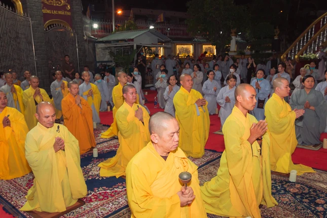 Mở đầu buổi lễ, dưới sự chứng minh và hướng dẫn của chư tôn đức Tăng Ni, gần 1.000 Phật tử hiện diện trong đêm hội đem hết tâm thành kính niêm hương bạch Phật và trì tụng kinh A Di Đà.