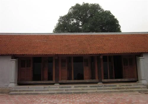 Cây đào tiên (sau bức phù điêu) trăm tuổi trĩu quả trong khuôn viên chùa Bà Đanh