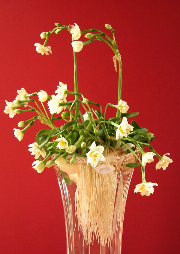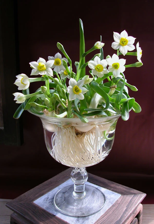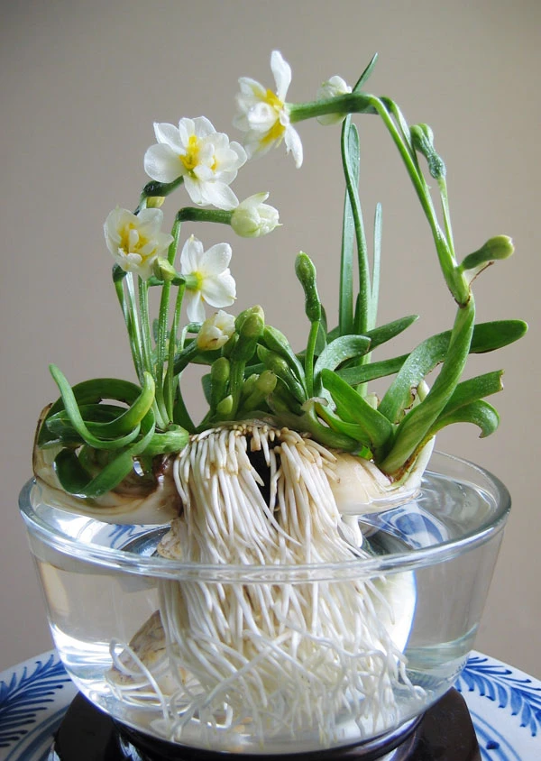 Thủy tiên đặt trong cốc thủy tinh trong suốt lộ ra bộ rễ trắng muốt, mập mạp tựa như râu bạc phơ của ông lão.