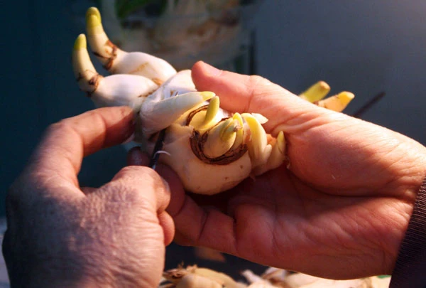 Để có được bát hoa thủy tiên đẹp như ý muốn, người chơi cầu kỳ chọn củ phải đủ 3 năm tuổi, vỏ ngoài mỏng và mầu cánh gián sẫm. Khi gọt phải chọn dao sắc, nhọn, gọt tỉ mỉ từng tí một để tránh vào mầm.