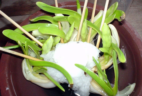 Củ thủy tiên khi gọt xong, phần vỏ còn bớt lại màu trắng tạo nên những móng rồng rất đẹp, thấp thoáng sau lá.