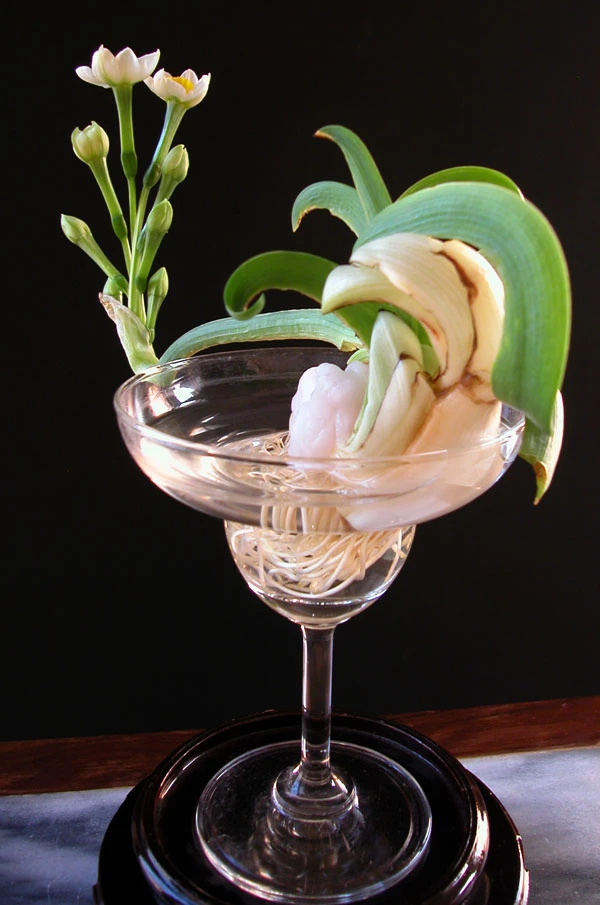 Lá thủy tiên có thể uốn thành những hình theo ý muốn hoặc để vươn dài cho bát hoa thêm sinh động.