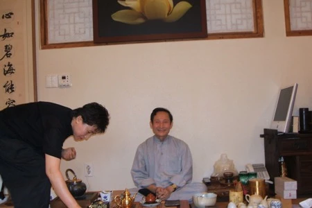 GS Lê Mạnh Thát đang thưởng trà đạo