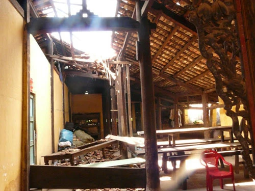 Trần nhà khu Đông lang đổ sụp, ngói rơi vỡ thành đống, kèo cũng bị sập xuống. Khu nhà bếp bị tốc mái để lộ một mảng trống hoác. Chưa kể những ngày mưa, chùa bị dột, thấm nước, nhà chùa phải mang thau chậu hứng nước tràn ra từ máng xối. Gian thờ bá tánh cũng bị mưa và mối dần dần phá hoại.