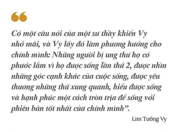 Có người chỉ cảm nhận những cơn đau của ung thư, còn những người như Tường Vy nhờ đó mà thực sự bắt đầu sống. Ung thư giúp Vy hiểu sâu sắc hơn về việc mình đang sống thông qua cái chết.