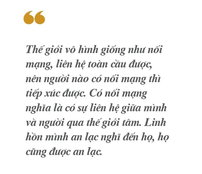 Thế giới vô hình giống như nối mạng, liên hệ toàn cầu được, nên người nào có nối mạng thì tiếp xúc được. Có nối mạng nghĩa là có sự liên hệ giữa mình và người qua thế giới tâm. Linh hồn mình an lạc nghĩ đến họ, họ cũng được an lạc. Lúc tôi mới tu, dòng họ có nhiều người chết vì chiến tranh. Tôi tụng kinh, tham thiền thấy họ hiện ra, bằng tâm thanh tịnh và pháp Phật tác động cho họ, họ cũng được an vui, giải thoát. Và sau này, tôi cũng lại thấy họ, nhưng không thấy họ đau khổ nữa, mà thấy họ rất vui.