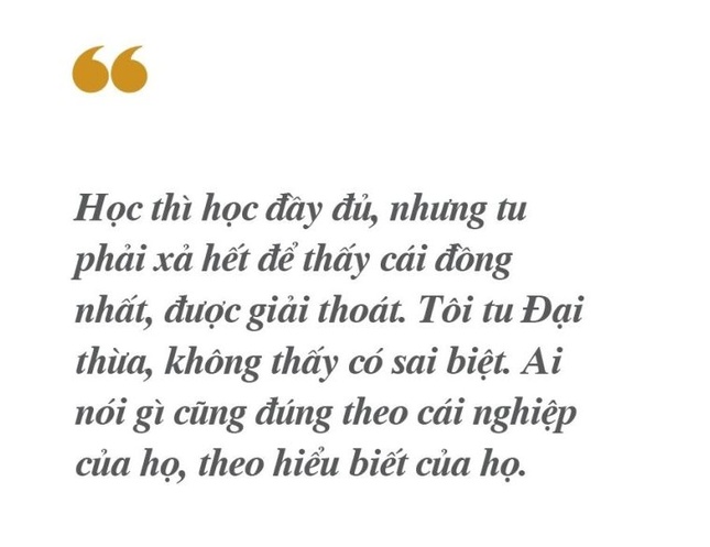 Theo tôi, học thì học đầy đủ, nhưng tu phải xả hết để thấy cái đồng nhất, được giải thoát. Tôi tu Đại thừa, không thấy có sai biệt. Ai nói gì cũng đúng theo cái nghiệp của họ, theo hiểu biết của họ. Nhưng mình muốn tất cả giống nhau, thành một thì không thể có. Chí lên Niết-bàn mới có sự đồng nhất, vì sáng mắt rồi, ai cũng thấy giống nhau. Còn mù mắt mà rờ thì thấy không giống. Chúng ta không rơi vô ngoại đạo, nhưng theo Phật đạo, tâm thanh tịnh, trí sáng suốt là chư Phật thấy giống nhau.