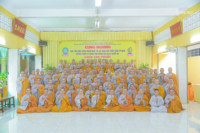 Phái đoàn cũng đã đến thăm trường hạ Ni tập trung chùa Vạn Phước (Q.Bình Tân). Ni trưởng Thích nữ Viên Giác, Hóa chủ hạ trường cùng Ban Chức sự hạ trường với 121 hành giả an cư đã trang nghiêm cung nghinh chư tôn đức quang lâm.