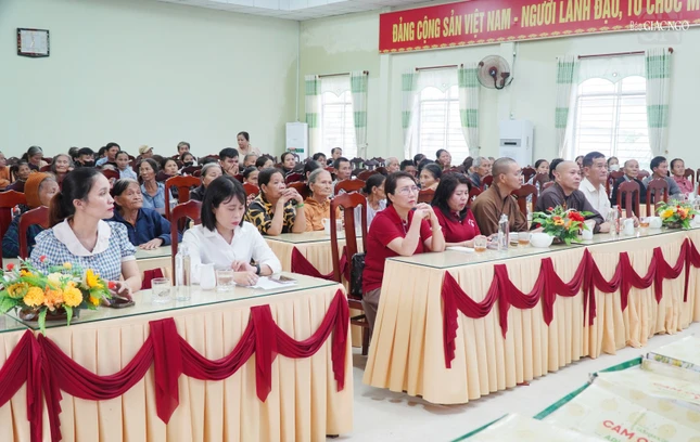 Bà con nhận quà tại Nhà văn hóa thôn Lục Đông, xã An Thắng |