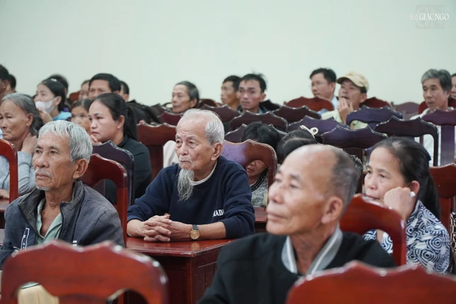 Bà Nguyễn Thị Thân cùng bà con địa phương đến Nhà văn hóa thôn Phong Lục Đông nhận quà |
