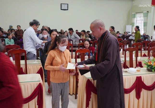 Tại điểm tặng quà thứ hai - Nhà văn hóa thôn Phong Lục Đông, phường An Thắng, TP.Đà Nẵng, trước giờ trao quà, trời mưa to bất chợt nhưng bà con vẫn kiên nhẫn chờ đợi. Đến từ sớm và lắng nghe đầy đủ những lời chia sẻ từ chư tôn đức, bà Nguyễn Thị Thân (sinh năm 1938) bày tỏ: "Được chư Tăng Ni cùng các nhà hảo tâm thương quý hỗ trợ những phần quà đến bà con bị bão lũ, tôi cảm ơn rất nhiều".