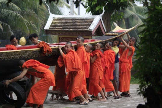 Các sư cùng di chuyển chiếc thuyền chuẩn bị cho một lễ hội