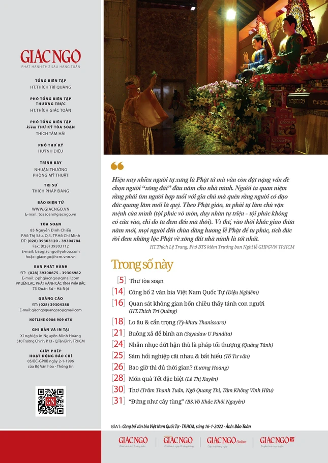- Mục Phật học, đăng bài giảng: "Quan sát không gian bốn chiều thấy tánh con người" do Hòa thượng Thích Trí Quảng giảng tại chùa Huê Nghiêm; "Lo âu và cẩn trọng" (Tỳ-khưu Thanissaro, Diệu Liên Lý Thu Linh chuyển ngữ); "Buông xả để bình an" (Sayadaw U Pandita, Phổ Quảng dịch).