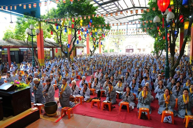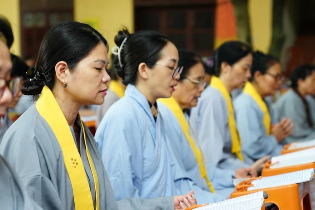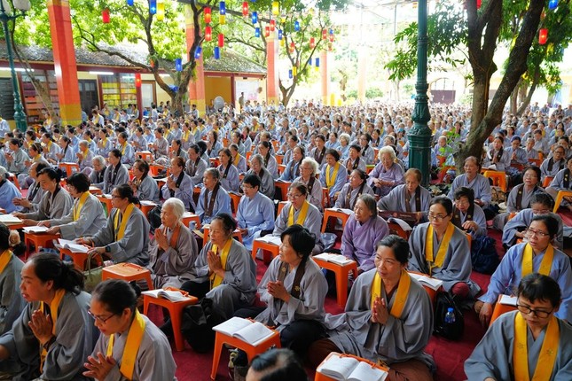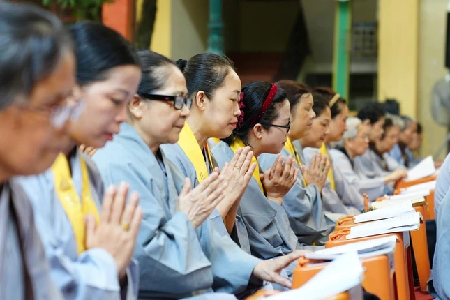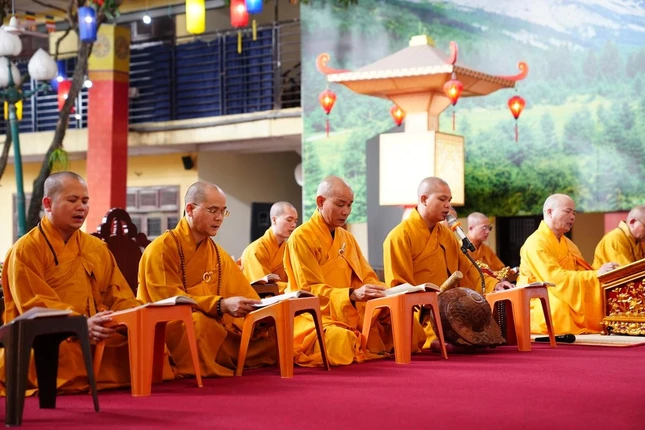 Sau thời pháp thoại, dưới sự chủ lễ của chư tôn đức, đại chúng đã cùng nhau trì tụng kinh Bản nguyện của Bồ-tát Địa Tạng và kinh Phổ môn, cầu nguyện quốc thái dân an, thế giới hòa bình, chúng sinh an lạc.