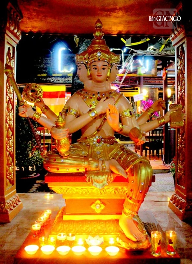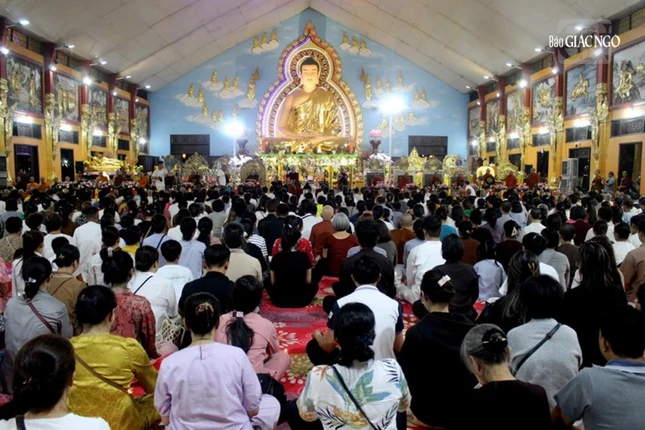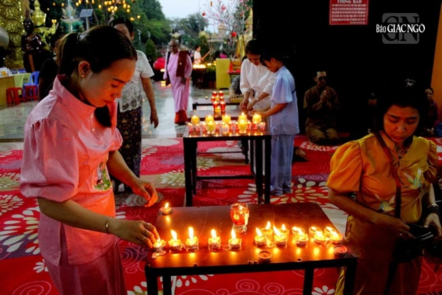 Đại chúng tụng kinh chúc phúc lành, thành kính dâng lên những cúng đèn tỏa sáng. Dịp này, nhóm Bàn Tay Nhân Ái (TP.HCM) cúng dường bộ kinh Pali gồm 118 cuốn, chuyển thể từ ngôn ngữ Sankrit bản khắc đá sang bản Pali thông dụng.