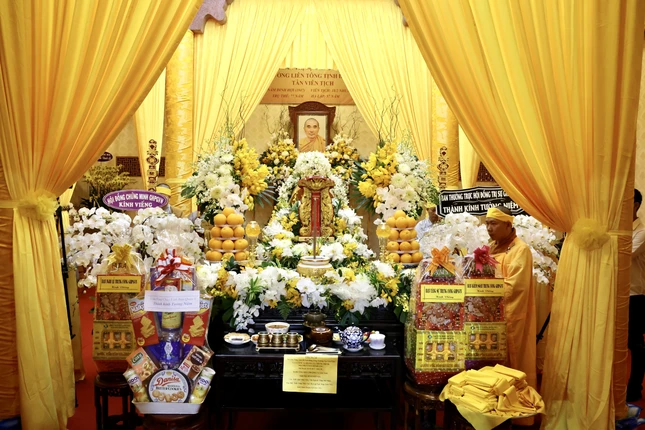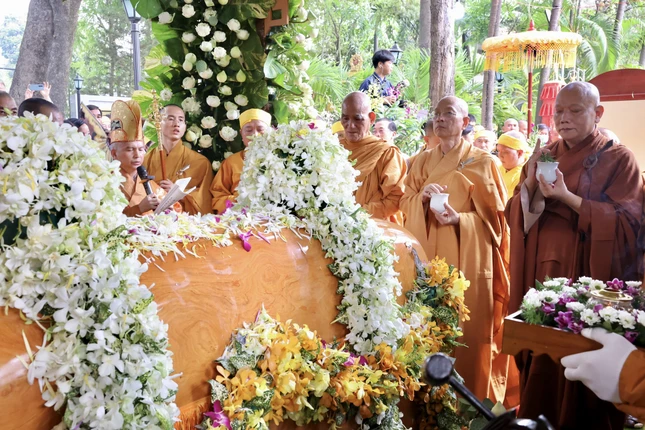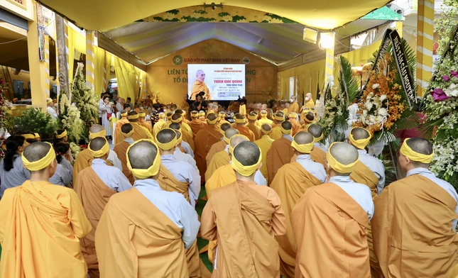 Trước Giác linh đường, chư tôn đức giáo phẩm đã dâng hương tưởng niệm Trưởng lão Hòa thượng Thích Giác Quang. Sau đó, Hòa thượng sám chủ thực hiện nghi thức phất trần, tuyên pháp ngữ và phụng tống kim quan cố Trưởng lão Hòa thượng nhập bảo tháp tại khuôn viên tổ đình Quan Âm.