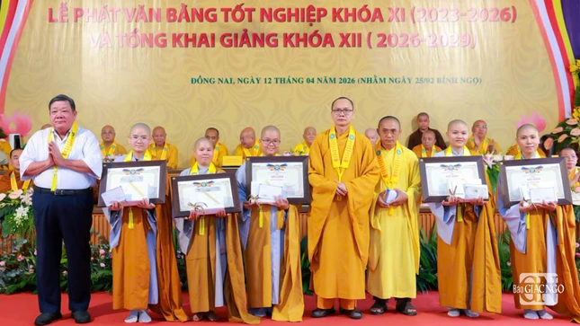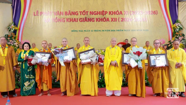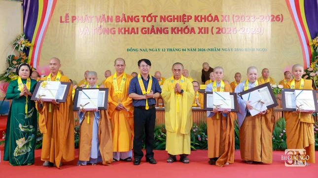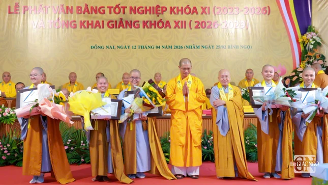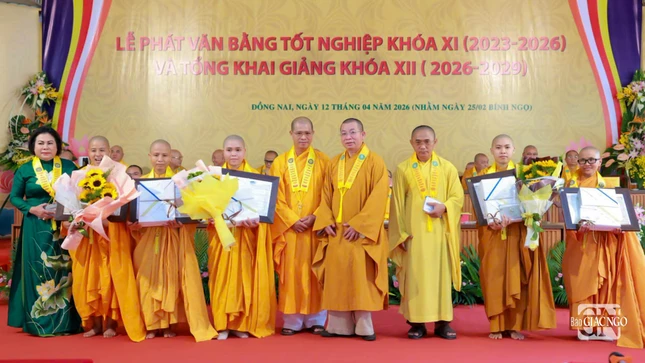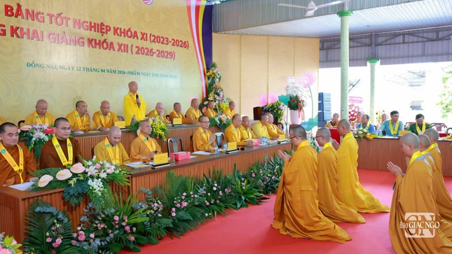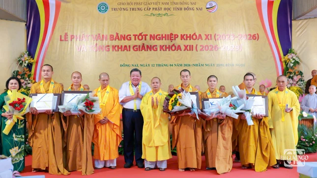 GNO - Sáng 7-4, Trường Trung cấp Phật học tỉnh Đồng Nai đã tổ chức Lễ tổng kết, trao văn bằng tốt nghiệp cho Tăng Ni sinh khóa XI (2023-2026) và khai giảng năm học mới khóa XII (2026-2029) tại cơ sở Ni - chùa Huệ Giác, xã Long Phước.