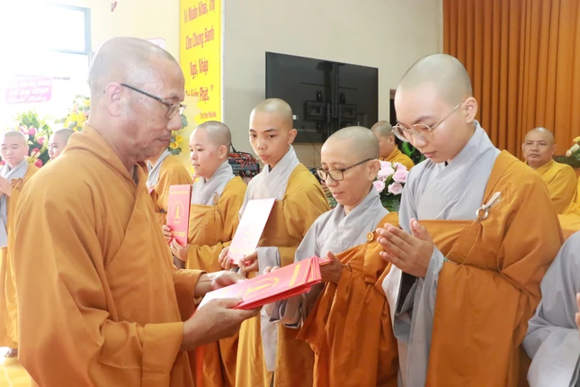 Tại buổi lễ, Thượng tọa Thích Minh Sơn, Chánh Thư ký Ban Trị sự GHPGVN tỉnh Đồng Tháp thông qua quyết định của Ban Trị sự GHPGVN tỉnh tặng Bằng công đức cho các tập thể và cá nhân đã đóng góp cho công tác đào tạo Tăng Ni sinh khóa IX được thành tựu.