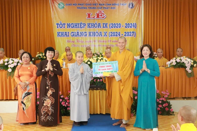 Dịp này, Ban Bảo trợ Trường Trung cấp Phật học tỉnh Đồng Tháp đã ra mắt và trao tặng 2 học bổng, mỗi phần trị giá 1.200 USD cho Tăng Ni sinh du học và trao tặng 70 thẻ Bảo hiểm y tế đến Tăng Ni sinh khóa X.