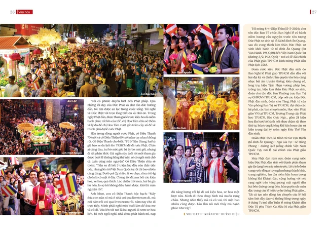 Hòa trong dòng người rước Phật, cô Diệu Thanh 70 tuổi và cô Diệu Thiện 69 tuổi nắm tay nhau không rời. Cô Diệu Thanh cho biết: “Từ ở Tiền Giang, hai bà già bao xe du lịch lên TP.HCM để đi rước Phật. Chân ai cũng đau, tui bó một gối, bà ấy bó một gối, nhưng đi rất phấn khởi. Già ngần này tuổi rồi mới tham gia được buổi lễ thiêng liêng thế này, về có ngồi một chỗ cả tuần cũng mãn nguyện”. Cô Diệu Thiện chia sẻ thêm: “Tiền xe đi hết 3 triệu, lúc đầu còn thấy tiếc tiếc, nhưng lên tới Việt Nam Quốc tự rồi thì bao nhiêu cũng đáng. Dưới quê 2g chiều là xe chạy, chưa tới 4g chiều là có mặt ở đây. Chúng tôi đi xem hết các kiệu hoa, xe hoa, quá thích. Lúc chiều trời mưa, hai bà già hú hồn, lo sợ tối không diễu hành được. Giờ thì mãn nguyện rồi”.