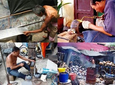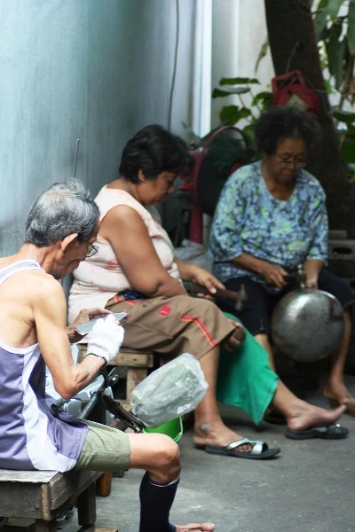 Sau cánh cổng dẫn vào làng, chúng tôi choáng ngợp với sự xuất hiện của hàng loạt những hẻm nhỏ cùng sự chào đón nồng nhiệt của những cư dân trong làng. Đi qua vài con hẻm, bà dẫn chúng tôi đến một xưởng làm bình bát tiêu biểu trong làng. Ở đây, du khách sẽ có cơ hội để tận mắt chứng kiến tất cả các công đoạn của quá trình làm ra một chiếc bình bát dành cho những nhà sư khất thực.