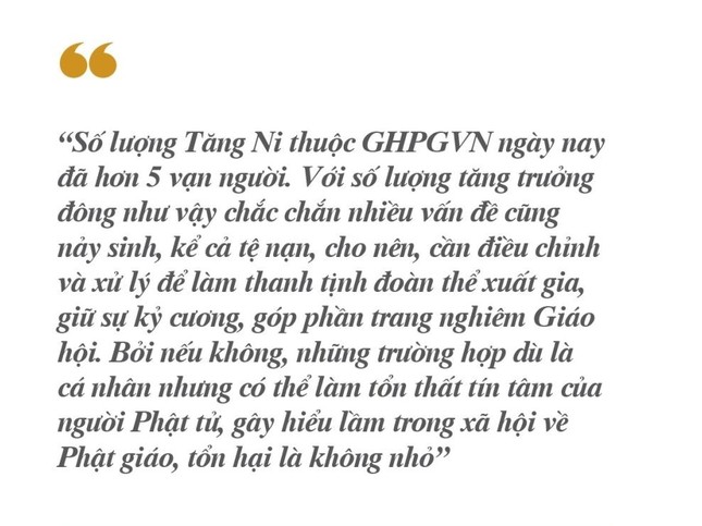 “Số lượng Tăng Ni thuộc GHPGVN ngày nay đã hơn 5 vạn người. Với số lượng tăng trưởng đông như vậy chắc chắn nhiều vấn đề cũng nảy sinh, kể cả tệ nạn, cho nên, cần điều chỉnh và xử lý để làm thanh tịnh đoàn thể xuất gia, giữ sự kỷ cương, góp phần trang nghiêm Giáo hội. Bởi nếu không, những trường hợp dù là cá nhân nhưng có thể làm tổn thất tín tâm của người Phật tử, gây hiểu lầm trong xã hội về Phật giáo, tổn hại là không nhỏ”, ngài nói.