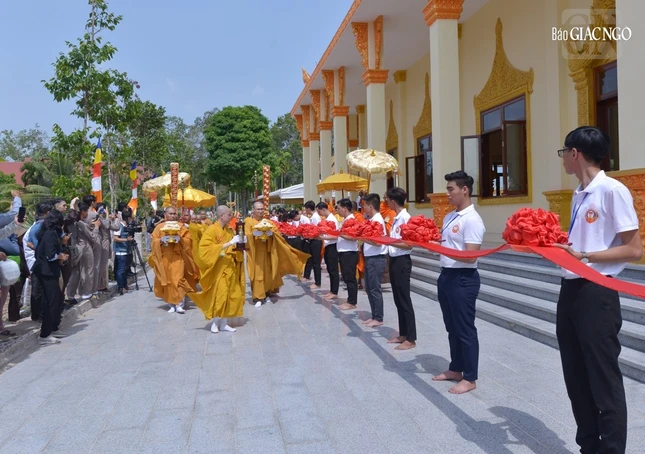 Cung nghinh Đức Pháp chủ và chư vị giáo phẩm Hội đồng Chứng minh GHPGVN quang lâm lễ đường Học viện Phật giáo Nam tông Khmer tại TP.Cần Thơ - Ảnh: Bảo Toàn/BGN